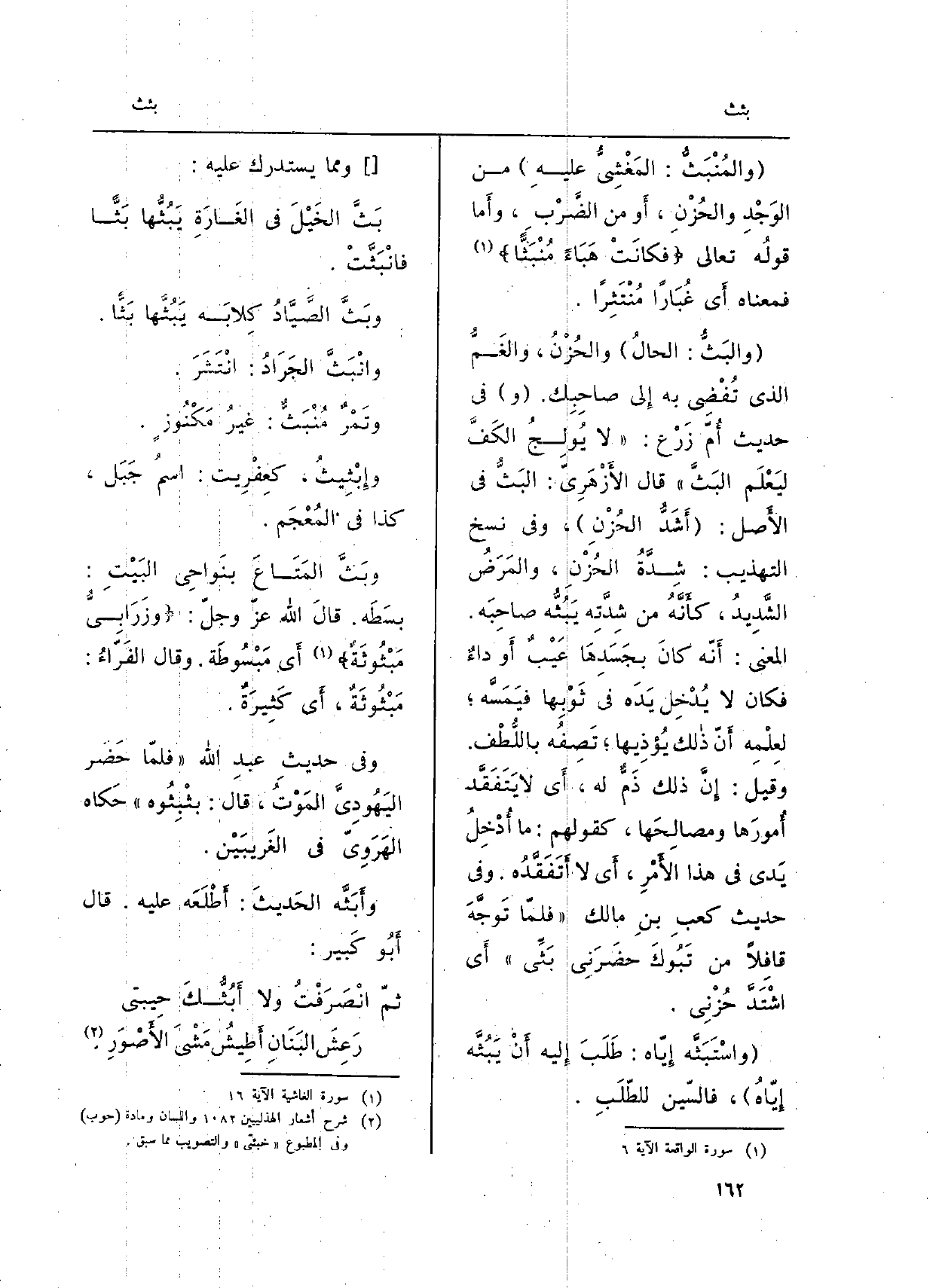 وبَثَّ المَتَاعَ بنَواحِي البَيْتِ: بسَطَه. قالَ الله عزّ وجلّ: {وَزَرَابِيُّ} مَبْثُوثَةٌ} (سُورَة الغاشية، الْآيَة: 16) أَي مَبْسُوطَة. وَقَالَ الفَرّاءُ: مَبْثُوثَةٌ، أَي كَثِيرَةٌ.