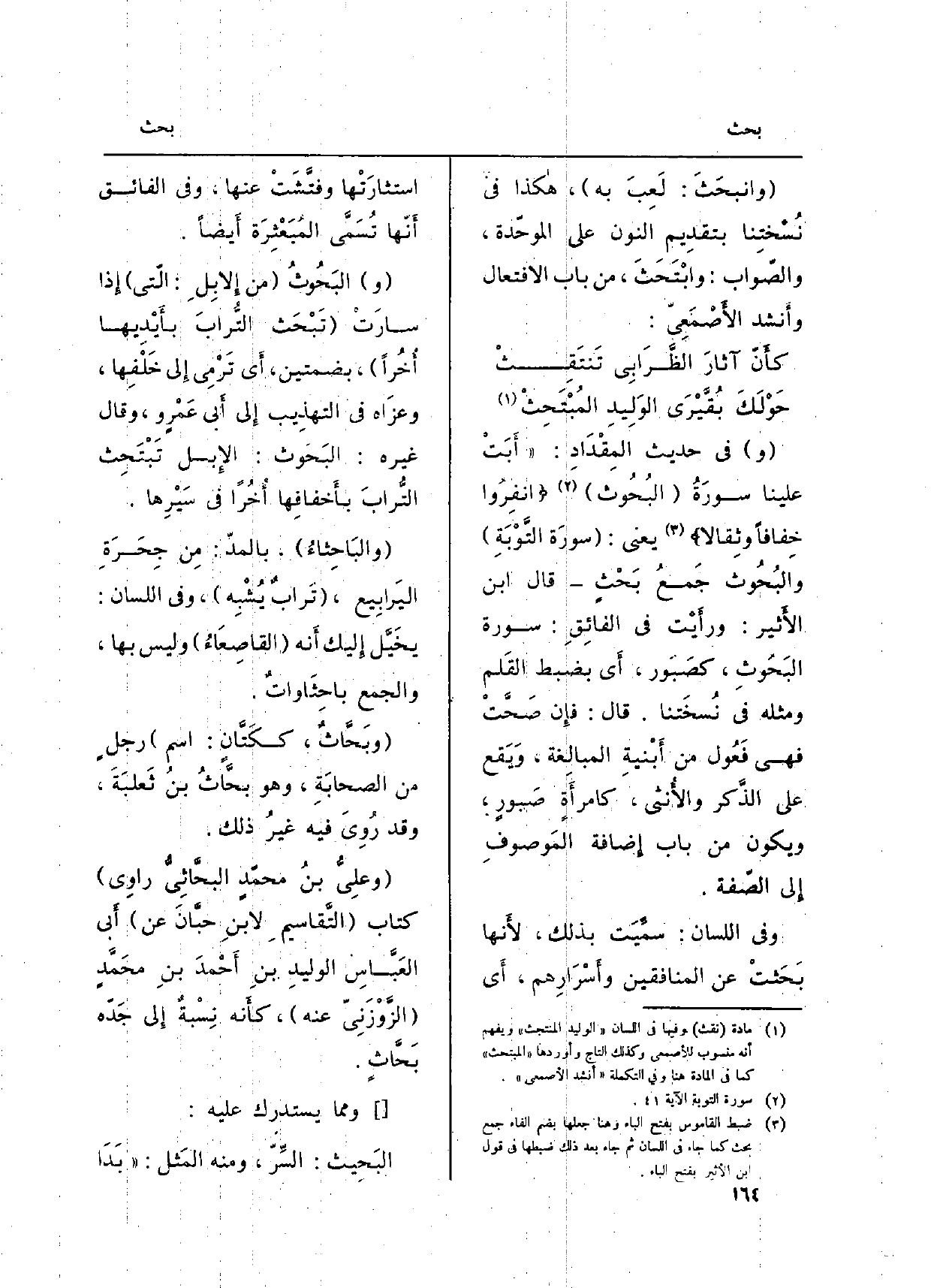 (و) فِي حَدِيث المِقْدَادِ: (أَبَتْ علينا سورَةُ (البُحُوث) {انْفِرُواْ خِفَافًا وَثِقَالاً} (سُورَة التَّوْبَة، الْآيَة: 41) يَعْنِي: (سورَة التَّوْبةِ) والبَحُوث جَمعُ بَحْثٍ قَالَ ابْن الْأَثِير: ورأَيْت فِي الفائِقِ: سُورَة البَحُوث، كصَبَور، أَي بضبط القَلم وَمثله فِي نُسخَتنا. قَالَ: فإِن صَحَّتْ فَهِيَ فَعُول من أَبْنيةِ الْمُبَالغَة، وَيَقع على الذَّكر والأُنثى، كامرأَةٍ صَبورٍ وَيكون من بَاب إِضافة المَوصوفِ إِلَى الصّفة.