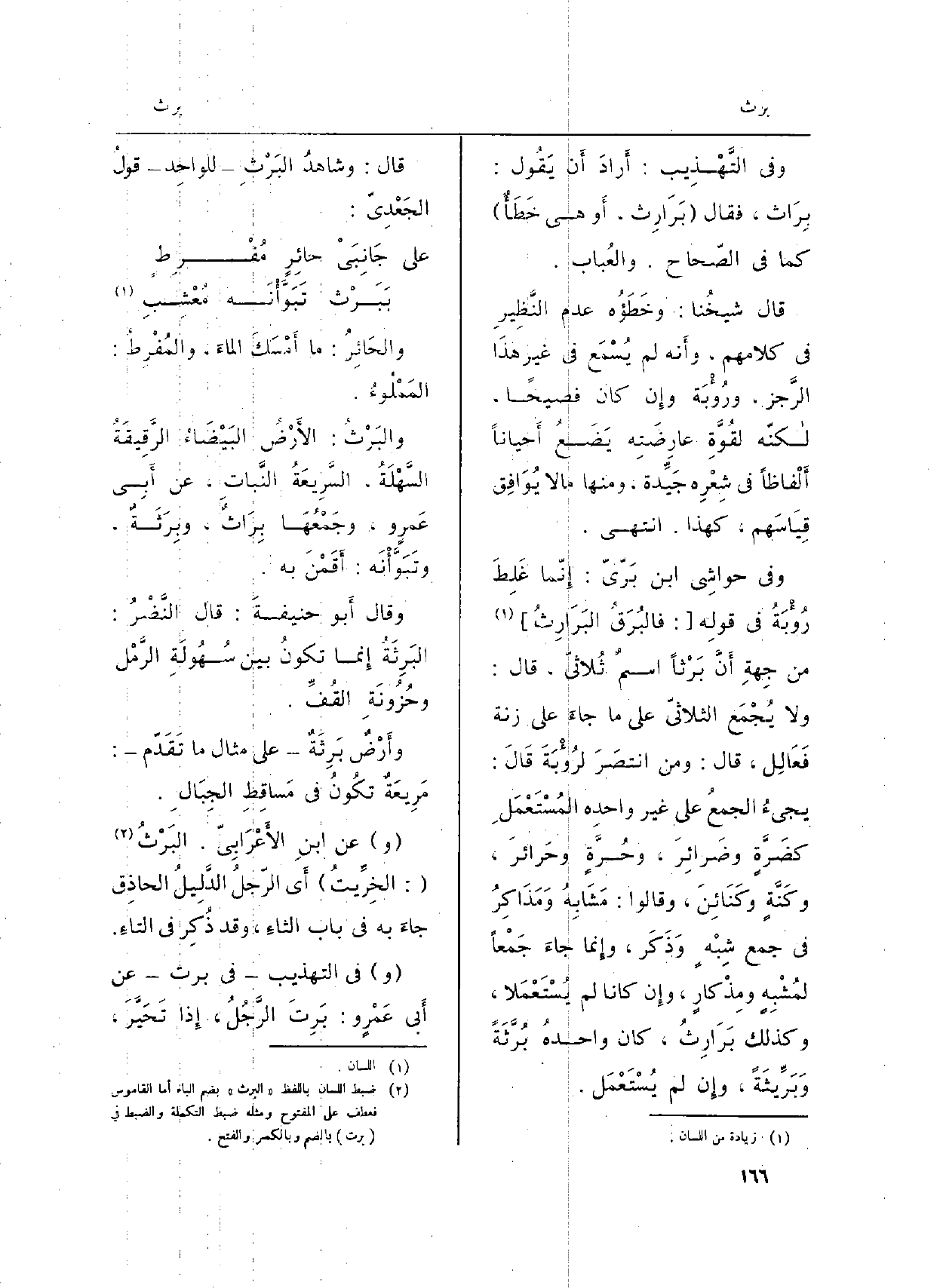 وَفِي حواشِي ابْن بَرّيّ: إِنّما غَلِطَ رُؤْبَةُ فِي قولِه (: فالبُرَقُ البَرَارِثُ) من جِهةِ أَنَّ بَرْثاً اسمٌ ثُلاثيّ، قَالَ: وَلَا يُجْمَع الثلاثيّ على مَا جاءَ على زنة فَعَالِل، قَالَ: وَمن انتصَرَ لرُؤْبَةَ قَالَ: يجيءُ الجمعُ على غير واحدِه المُسْتَعْمَلِ كضَرَّةٍ وضَرائِرَ، وحُرَّةٍ وحَرائرَ، وكَنَّةٍ وكَنَائِنَ، وَقَالُوا: مَشَابِهُ وَمَذَاكِرُ فِي جمع شِبْهٍ وَذَكَرَ، وإِنما جاءَ جَمْعاً لمُشْبِهٍ ومِذْكارٍ، وإِن كَانَا لم يُسْتَعْمَلا، وَكَذَلِكَ بَرَارِثُ، كَانَ واحدهُ بُرَّثَةً وَبَرِّيثَةً، وإِن لم يُسْتَعْمَل.