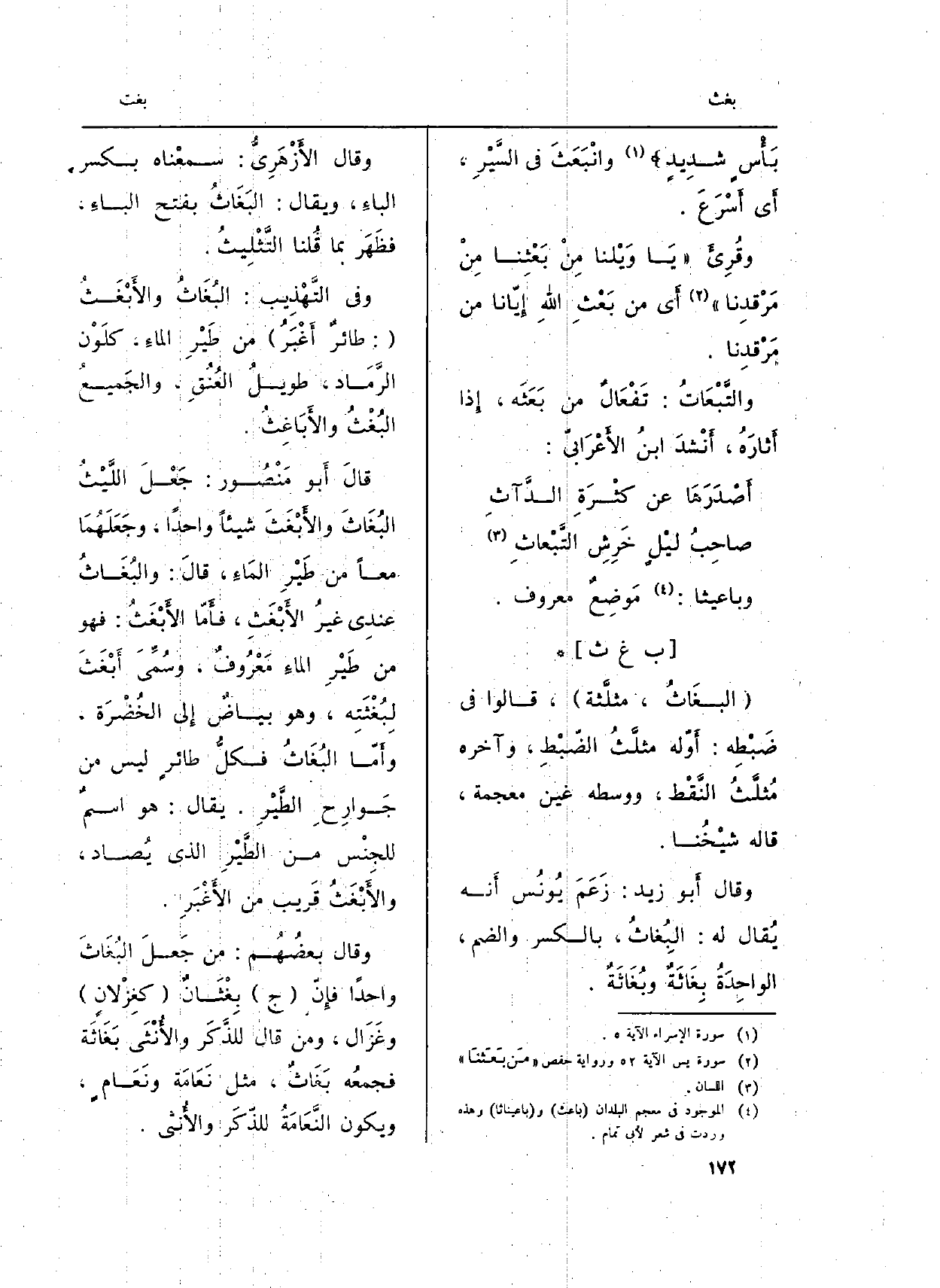 قالَ أَبو مَنْصُور: جَعْلَ اللَّيْثُ البُغَاثَ والأَبْغَثَ شَيْئا وَاحِدًا، وجَعَلَهُمَا مَعًا من طَيْره المَاءِ، قالَ: والبُغَاثُ عندِي غيرُ الأَبْغَثِ، فأَمّا الأَبْغَثُ: فَهُوَ من طَيْرِ الماءِ مَعْرُوفٌ، وسُمِّيَ أَبْغَثَ لِبُغْثَتِه، وَهُوَ بياضٌ إِلى الخُضْرَة، وأَمّا البُغَاثُ فكلُّ طائرٍ لَيْسَ من جَوارِحِ الطَّيْرِ. يُقَال: هُوَ اسمٌ للجنْسِ من الطَّيْرِ الَّذِي يُصاد، والأَبْغَثُ قَريب من الأَغْبَرِ.