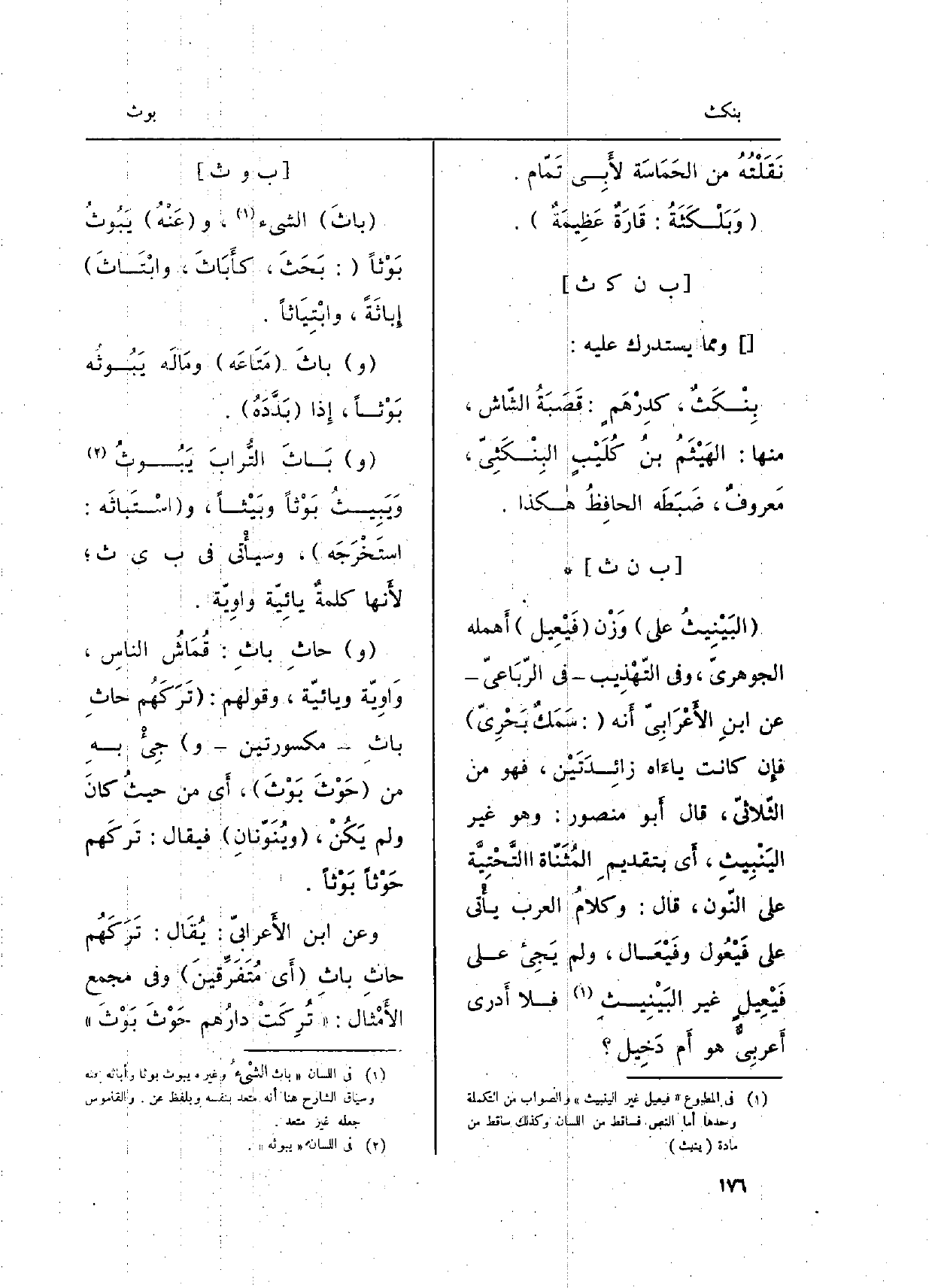 : (البَيْنِيثُ على) وَزحن (فَيْعِيل) أَهمله الجوهريّ، وَفِي التّهْذِيب فِي الرّبَاعيّ عَن ابنِ الأَعْرَابِيّ أَنه (: سَمَكٌ بَحْرِيّ) فإِن كَانَت ياءَاه زائِدَتعيْن، فَهُوَ من الثّلاثيّ، قَالَ أَبو مَنْصُور: وَهُوَ غير الَنْبِيثِ، أَي بتقديمِ المُثَنّاة التَّحْتِيَّة على النّون، قَالَ: وكلامُ الْعَرَب يأْتي على فَيْعُول وفعيْعَال، وَلم يَجهىء على فَيْعِيلٍ غير البَيْنِيثِ فَلَا أَدري أَعربِيٌّ هُوَ أَم دَخِيل؟