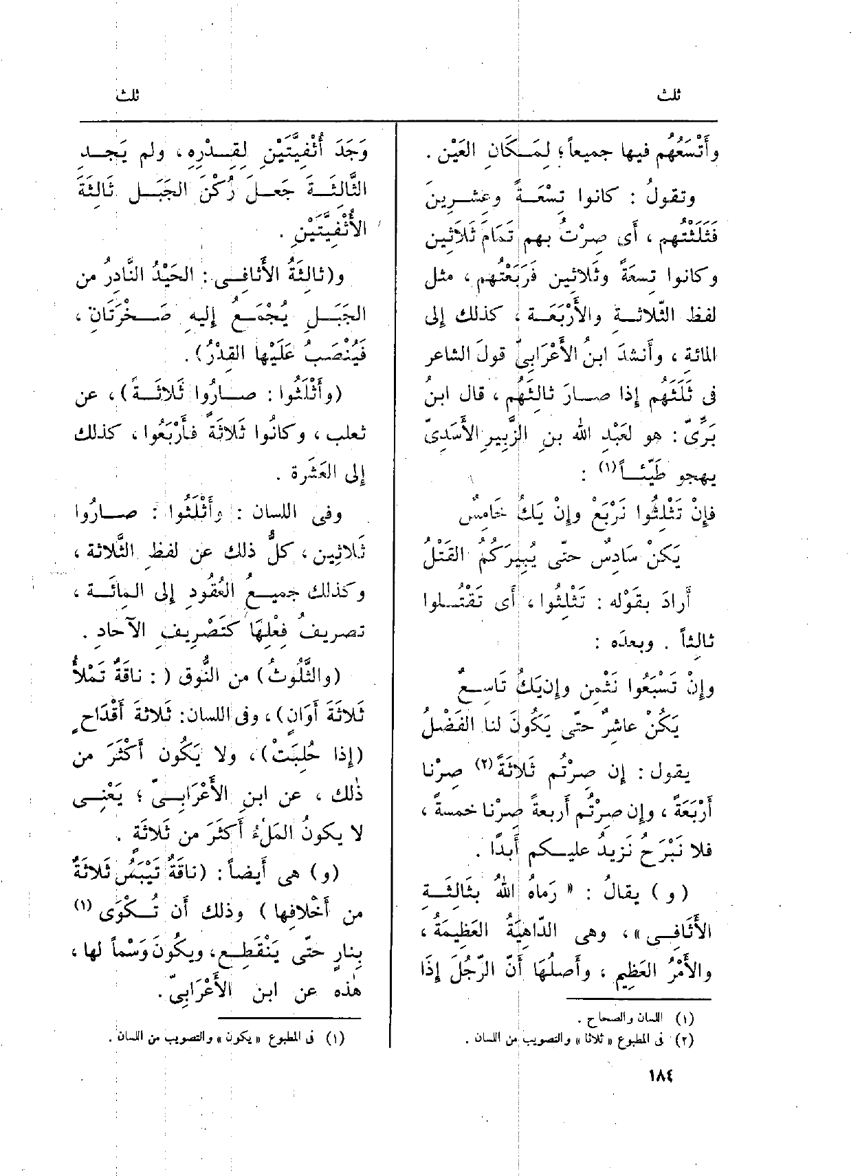 وتقولُ: كَانُوا تِسْعَةً وعِشرِينَ فَثَلَثْتُهم، أَي صِرْتُ بهم تَمَامَ ثلاَثِينَ وَكَانُوا تِسعَةً وثَلاثِين فَرَبَعْتُهم، مثل لفظ الثّلاثةِ والأَرْبَعَة، كَذَلِك إِلى المائةِ، وأَنشدَ ابنُ الأَعْرَابِيّ قولَ الشَّاعِر فِي ثَلَثَهُم إِذا صارَ ثالِثَهُم، قَالَ ابنُ بَرِّيّ: هُوَ لعَبْدِ الله بنِ الزَّبِيرِ الأَسَدِيّ يهجو طَيّئاً: