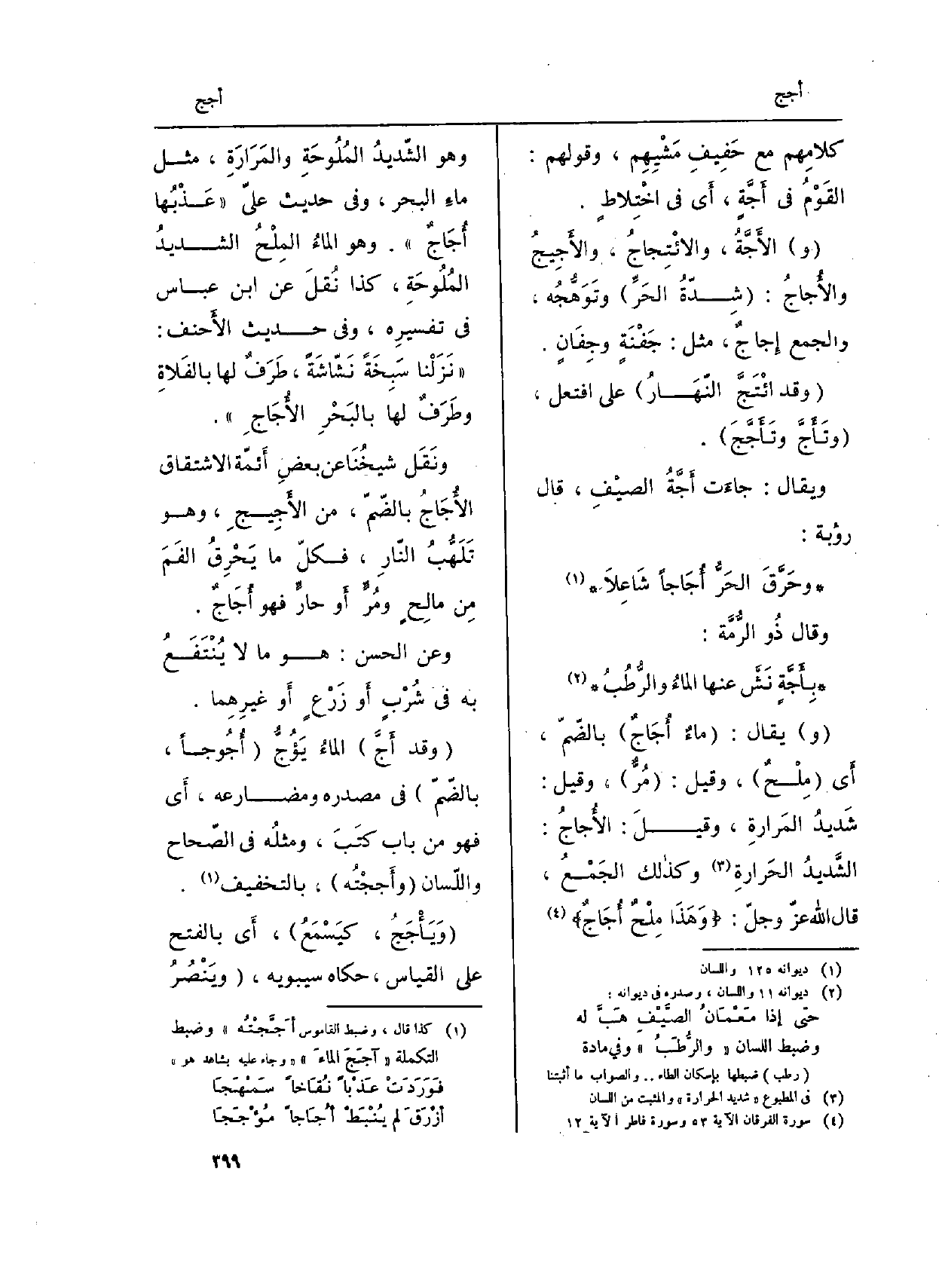 (و) يُقَال: (ماءٌ {أُجَاجٌ) بالضّمّ، أَي (مِلْحٌ) ، وَقيل: (مُرٌّ) ، وَقيل: شَديدُ المَرارةِ، وقيلَ:} الأُجاجُ: الشَّديدُ الحَرارةِ وكذالك الجَمْعُ، قَالَ الله عزّ وجلّ: {وَهَاذَا مِلْحٌ أُجَاجٌ} (سُورَة الْفرْقَان، الْآيَة: 53) وَهُوَ الشّديدُ المُلُوحَةِ والمَرَارَةِ، مثل ماءِ الْبَحْر، وَفِي حَدِيث عليّ (عَذْبُها أُجَاجٌ) . وَهُوَ الماءُ المِلْحُ الشديدُ المُلُوحَةِ، كَذَا نُقلَ عَن ابْن عَبَّاس فِي تفسيرِ، وَفِي حَدِيث الأَحنف: (نَزَلْنا سَبِخَةً نَشّاشَةً، طَرَفٌ لَهَا بالفَلاةِ وطَرَفٌ لَهَا بالبَحْرِ الأُجَاجِ) .