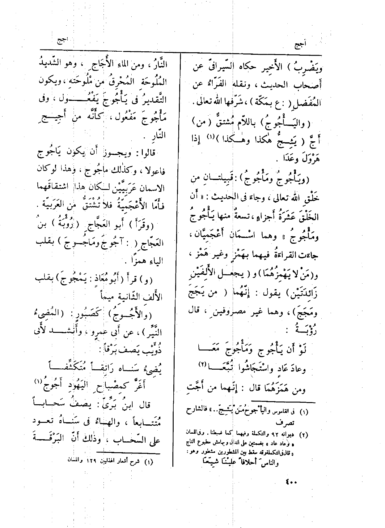 وَمن هَمَزَهُمَا قَالَ: إِنّهما من {أَجَّتِ النَّارُ، وَمن الماءِ الأُجَاجِ، وَهُوَ الشّديدُ المُلُوحَةِ المُحْرِقُ من مْلُوحَتهِ، وَيكون التَّقديرُ فِي يَأْجُوجَ يَفْعُول، وَفِي مَأْجُوجَ مَفْعُول، كأَنَّه من} أَجيج النّارِ.