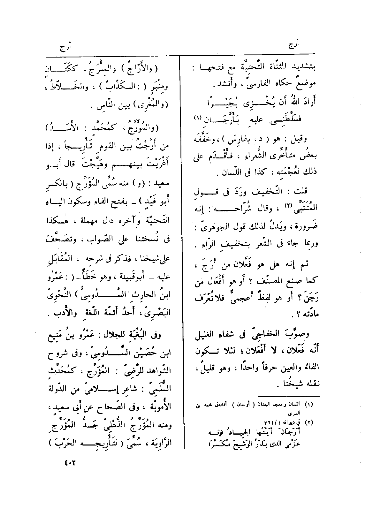 وَفِي البُغْيَةِ للجلال: عَمْرُو بنُ مَنِيع ابْن حُصَيْن السَّدُوسِيّ، وَفِي شُرُوح الشّواهد للرَّضِيّ: {المُؤَرِّج، كمُحَدِّثٍ السُّلَمِيّ: شاعِر إِسلاميّ من الدّولة الأُمويّة، وَفِي الصّحاح عَن أَبي سعيدٍ، وَمِنْه المُؤَرِّجُ الذُّهْلِيّ جَدُّ المُؤَرِّجِ الرَّاوِيَة، سُمِّيَ (} لتَأْرِيجِه الحَرْبَ)