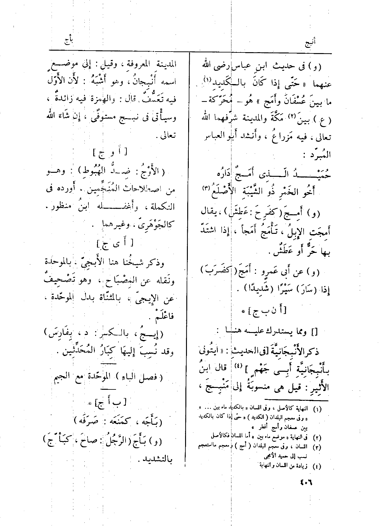 ذكر {الأَنْبِجَانِيَّةَ (فِي الحديثِ: (ايتُوني} بأَنْبِجَانِيَّةِ أَبيه جَهْمٍ) قَالَ ابنُ الأَثِيرِ: قيل هِيَ منسوبَةُ إِلى مَنْبِجَ، الْمَدِينَة المعروفِة، وَقيل: إِلى موضعٍ اسْمه {أَنْبِجانُ، وَهُوَ أَشْبَهُ: لأَن الأَوّل فِيهِ تَعَسُّفٌ، قَالَ: والهمزة فِي هزائدةٌ، وسيأْتي فِي نبج مستوفأ، إِن شَاءَ الله تَعَالَى.