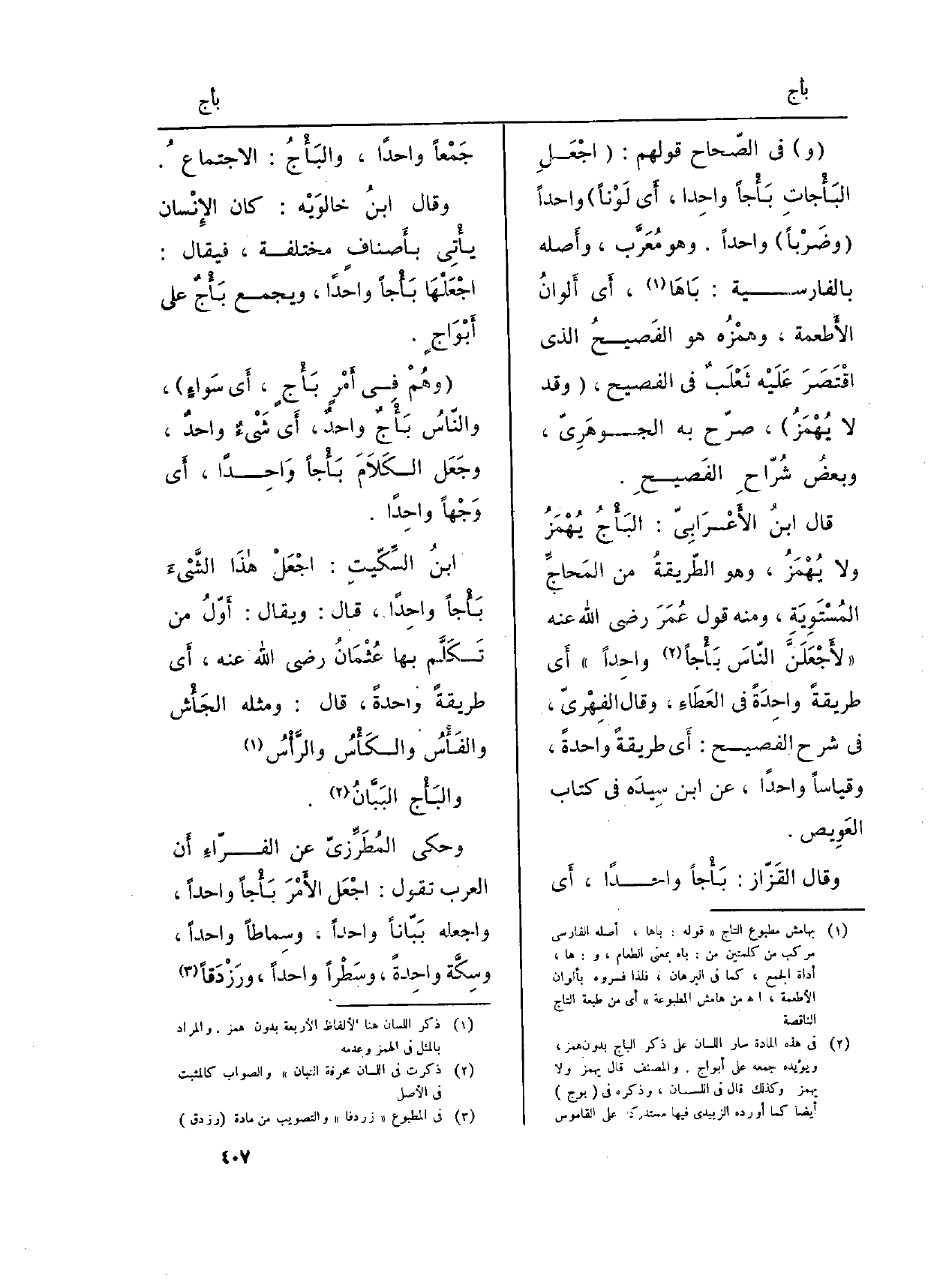 (و) فِي الصّحاح قَوْلهم: (اجْعَلِ {البَأْجاتِ} بأجا واحِدا، أَي لَوْناً) وَاحِدًا (وضَرْباً) وَاحِدًا. وَهُوَ مُعَرَّب، وأَصله بِالْفَارِسِيَّةِ: بَاهَا، أَي أَلوانُ الأَطعمة، وهمْزُه هُوَ الفَصيحُ الَّذِي اقْتَصَرع عَلَيْه ثَعْلَبٌ فِي الفصيح، (وَقد لَا يُهْمَزُ) ، صرّح بِهِ الجوهَرِيّ، وبعضُ شُرّاحِ الفَصيحِ.