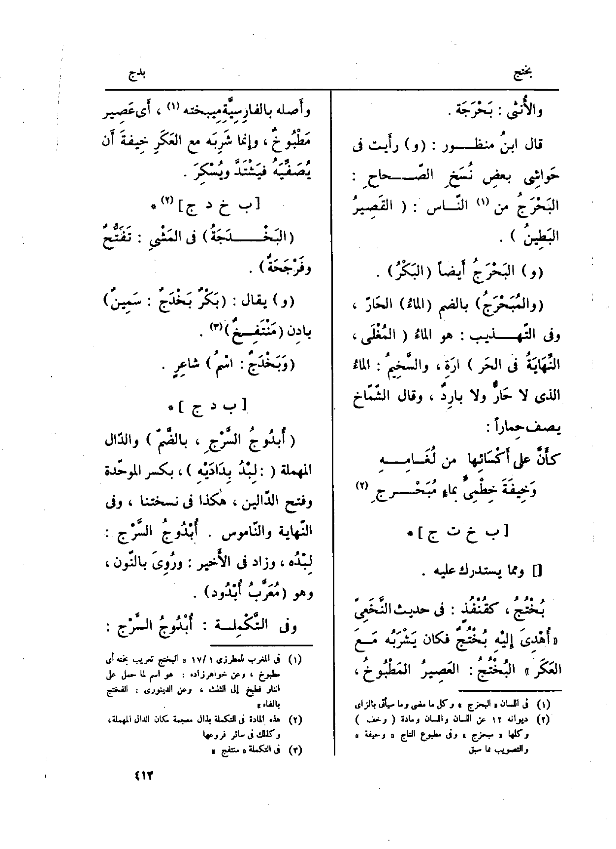 بُخْتُجُ، كقُنْفُذ: فِي حَدِيث النَّخَعِيّ (أُهْدِيَ إِليْهِ بُخْتُجٌ فَكَانَ يَشْرَبُه مَعَ العَكَر) البُخْتُجُ: العَصِيرُ المَطْبُوخُ، وأَصله بالفارِسِيَّةِ مِيبخته، أَي عَصِير مَطْبُوخٌ، وإِنما شَرِبَه مَعَ العَكَرِ خِيفَة أَن يُصَفِّيَهُ فيَشْتَدَّ ويُسْكِرَ.
