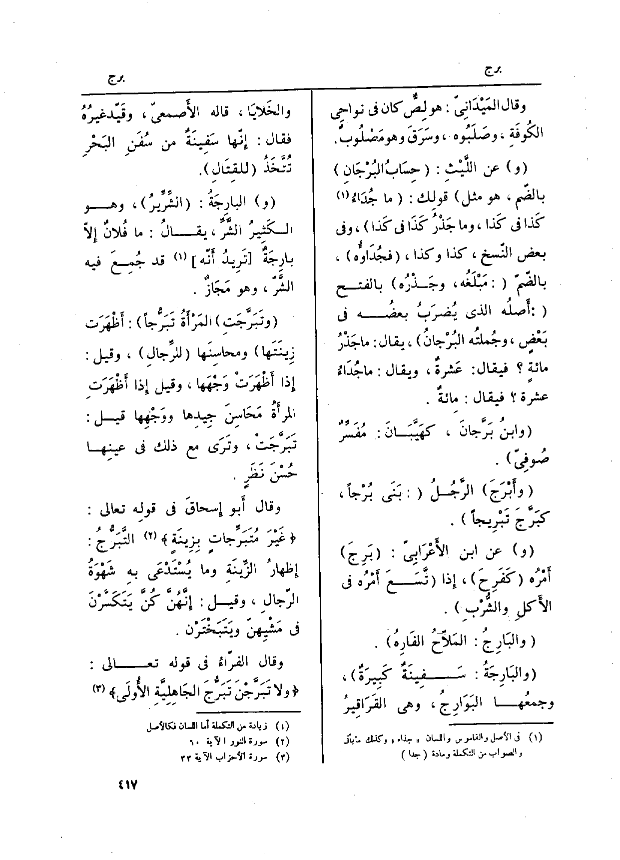 وَقَالَ الفرّاءُ فِي قَوْله تَعَالَى: {وَلاَ تَبَرَّجْنَ تَبَرُّجَ الْجَاهِلِيَّةِ الاْولَى} (سُورَة الْأَحْزَاب، الْآيَة: 33)