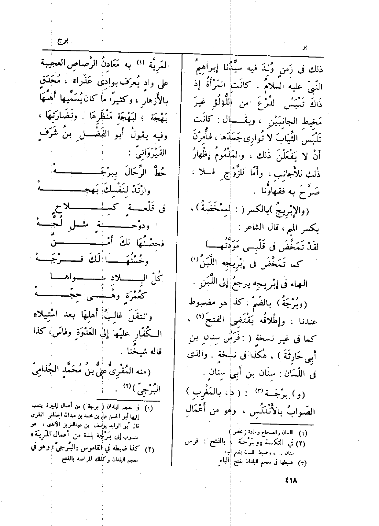 (و) برْجَة: (د، بالمَغْرِبِ) الصّوابُ بالأَنْدَلُسِ، وَهُوَ من أَعْمالِ المَرِيَّة بِهِ مَعَادِنُ الرَّصاصِ العجيبة على وادٍ يُعرفَ بوادِي عَذْراءَ، مُحَدَّقٍ بالأَزهارِ، وَكَثِيرًا مَا كَانَ يُسَمِّيها أَهلُهَا بَهْجَة؛ لبَهْجَةِ مَنْظَرِهَا. ونَضَارَتِهَا، وَفِيه يقولُ أَبو الفَضْلِ بنُ شَرَفٍ القَيْرَوَانِيّ: