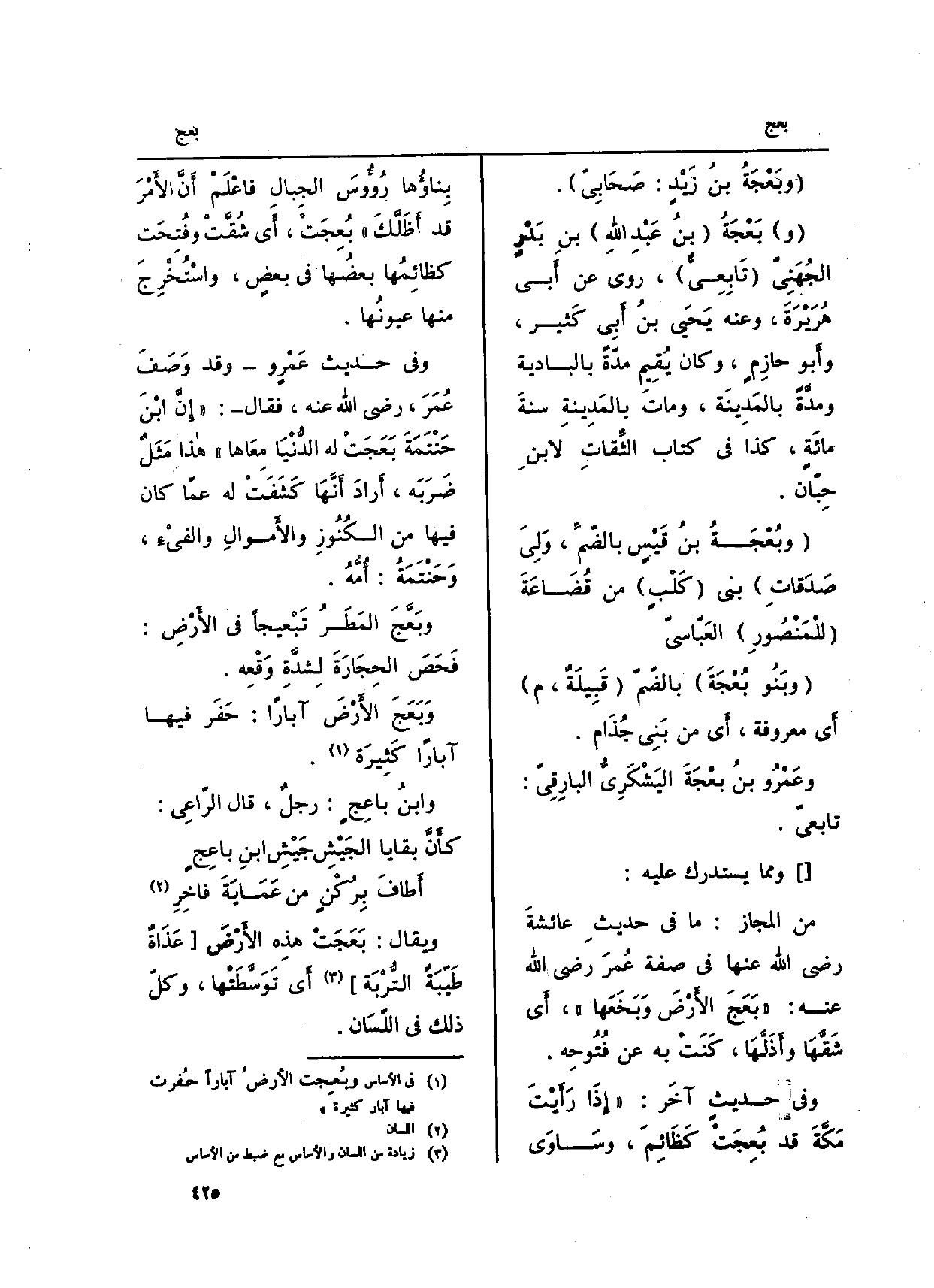 (و) بَعْجَةُ (بنُ عَبْدِ الله) بنِ بَدْرٍ الجُهَنِيّ (تَابِعَيٌّ) ، روى عَن أَبي هُرَيْرَةَ، وَعنهُ يَحْيَى بنُ أَبِي كَثير، وأَبو حازِمٍ، وَكَانَ يُقِيم مدّةً بالبادية ومدَّةً بالمَدِينَة، وماتَ بالمَدِينةِ سنةَ مائَةٍ، كَذَا فِي كتاب الثِّقاتِ لابنِ حِبّان.