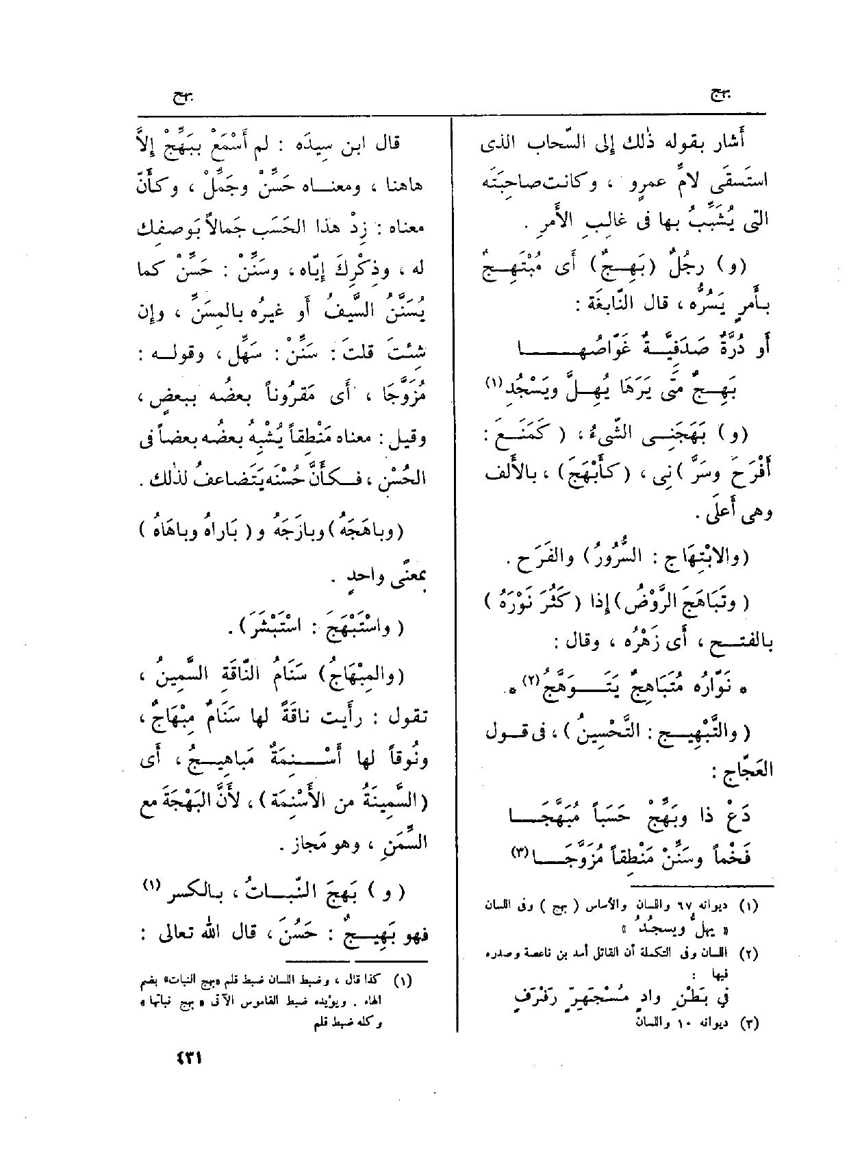 قَالَ ابْن سِيدَه: لم أَسْمَعْ ببَهِّجْ إِلاَّ هَاهُنَا، وَمَعْنَاهُ حَسِّنْ وجَمِّلْ، وكأَنّ مَعْنَاهُ: زِدْ هَذَا الحَسَب جَمالاً بَوصفِك لَهُ، وذِكْرِكَ إِيّاه، وسَنِّنْ: حَسِّنْ كَمَا يُسَنَّنُ السَّيفُ أَو غيرُه بالمِسَنِّ، وإِن شِئتَ قلتَ: سَنِّنْ: سَهِّل، وَقَوله: مُزَوَّجَا، أَي مَقرُوناً بعضُه ببعضٍ، وَقيل: مَعْنَاهُ مَنْطِقاً يُشْبِهُ بعضُه بَعْضًا فِي الحُسْن، فكأَنَّ حُسْنَه يَتَضاعفُ لذالك.