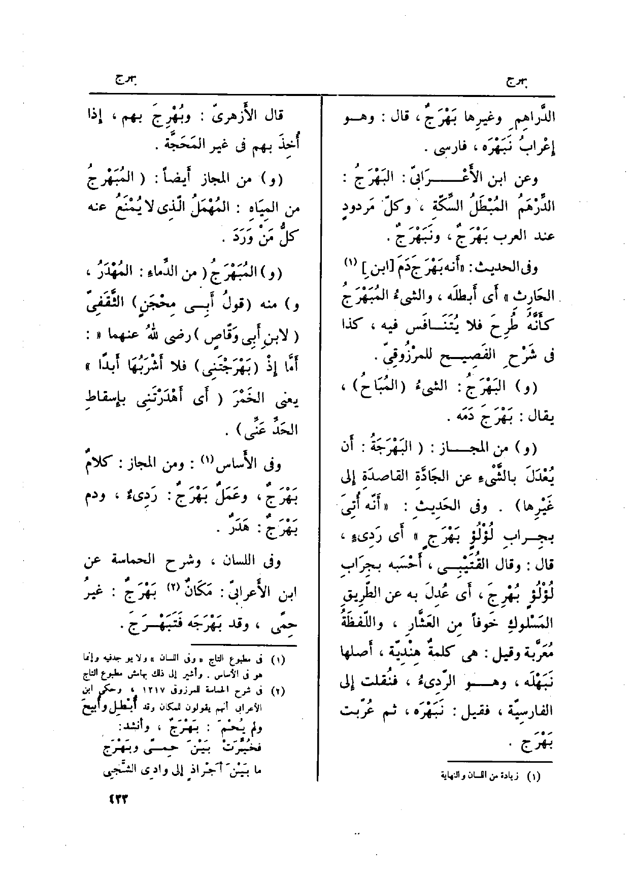 وَفِي اللِّسَان، وَشرح الحماسة عَن ابْن الأَعرابيّ: مَكَانٌ بَهْرَجٌ: غيرُ حِمًى، وَقد بَهْرَجَه فَتَبَهْرَجَ.