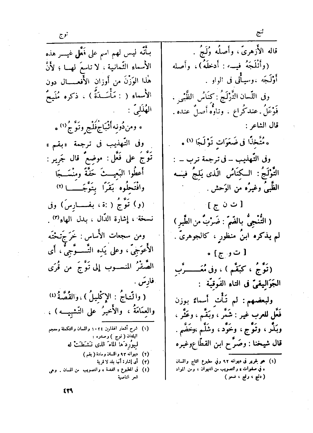 وَفِي التّهذيب فِي تَرْجَمَة (بقم) تَوَّجُ على فَعَّل: موضِعٌ قَالَ جَرِير: