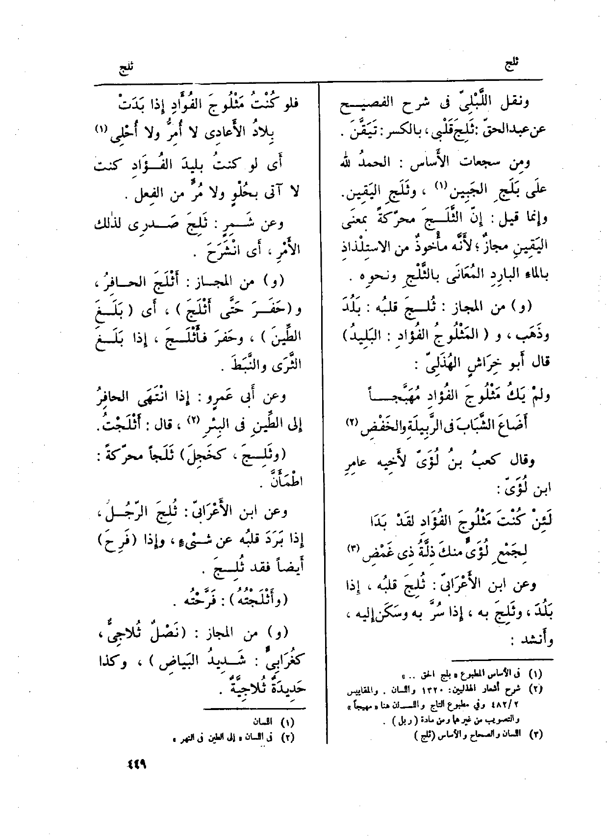 وَمن سجعات الأَساس: الحمدُ لله علَى بَلَجه الجَبِين، وثَلَجِ اليَقِين. وإِنما قيل: إِنّ الثَّلَجَ محرّكةً بمعنَى اليَقِينِ مجازٌ؛ لأَنَّه مأْخوذٌ من الاستِلْذاذِ بالماءِ البارِدِ المُعَانَى بالثَّلْجِ ونحوِه.