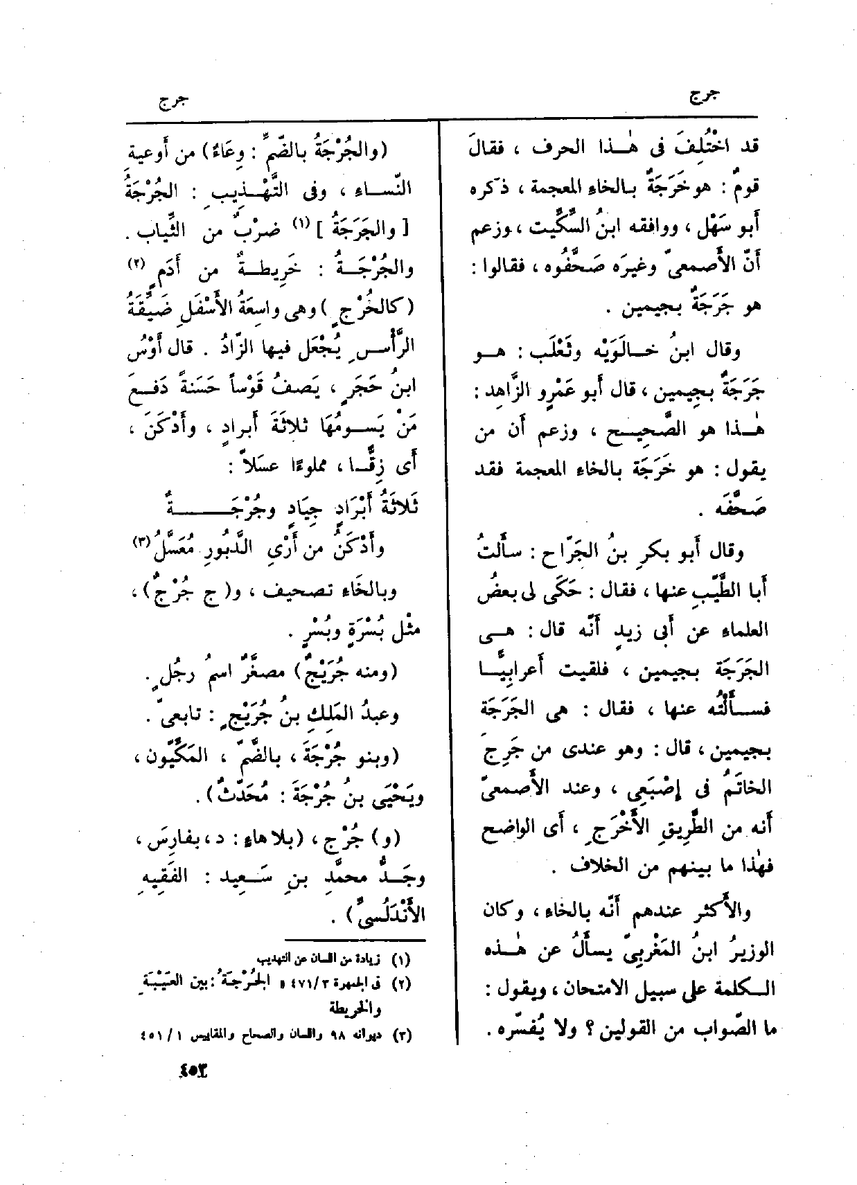 وَقَالَ أَبو بكرٍ بنُ الجَرّاح: سأَلتُ أَبا الطَّيّبِ عَنْهَا، فَقَالَ: حَكَى لي بعضُ العلماءِ عَن أَبي زيدٍ أَنّه قَالَ: هِيَ الجَرَجَة بجيمين، فَلَقِيت أَعرابِيًّا فسأَلْتُه عَنْهَا، فَقَالَ: هِيَ الجَرَجَة بجيمين، قَالَ: وَهُوَ عِنْدِي من جَرِجَ الخاتَمُ فِي إِصْبَعِي، وَعند الأَصمعيّ أَنه من الطَّرِيقِ الأَخْرَجِ، أَي الْوَاضِح فهاذا مَا بَينهم من الْخلاف.