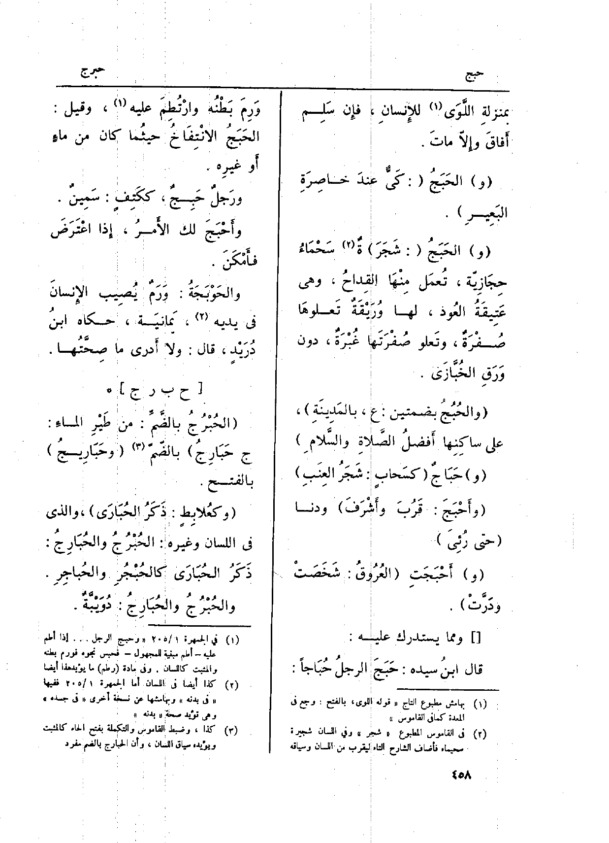 قَالَ ابنُ سَيّده: حَبَجَ الرجلُ حُبَاجاً: وَرِمَ بَطْنُه وارْتَطِمَ عَلَيْهِ، وَقيل: الحَبَجُ الانْتِفَاخُ حيثُما كَانَ من ماءٍ أَو غيرِه.