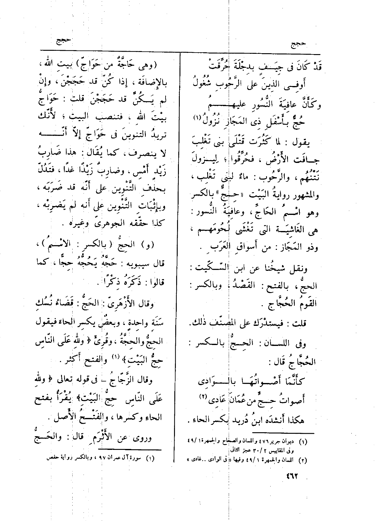 (وَهِي {حَاجَّةٌ من} حَوَاجّ) بيتِ الله، بالإِضافَة، إِذا كُنّ قد {حَجَجْنَ، وإِنْ لم يَكُنَّ قد} حَجَجْنَ قلت: {حَوَاجُّ بيْتَ الله، فتنصب الْبَيْت؛ لأَنّك تريدُ التنوينَ فِي حَوَاجّ إِلاّ أَنّه لَا ينْصَرف، كَمَا يُقَال: هَذَا ضَارِبُ زَيْدٍ أَمْسِ، وضارِبٌ زَيْداً غَدا، فتَدُلّ بِحَذْف التَّنْوِين على أَنّه قد ضَرَبَه، وبإِثْبَاتِ التَّنْوِين على أَنه لم يَضْرِبْه، كَذَا حقّقه الجوهريّ وَغَيره.