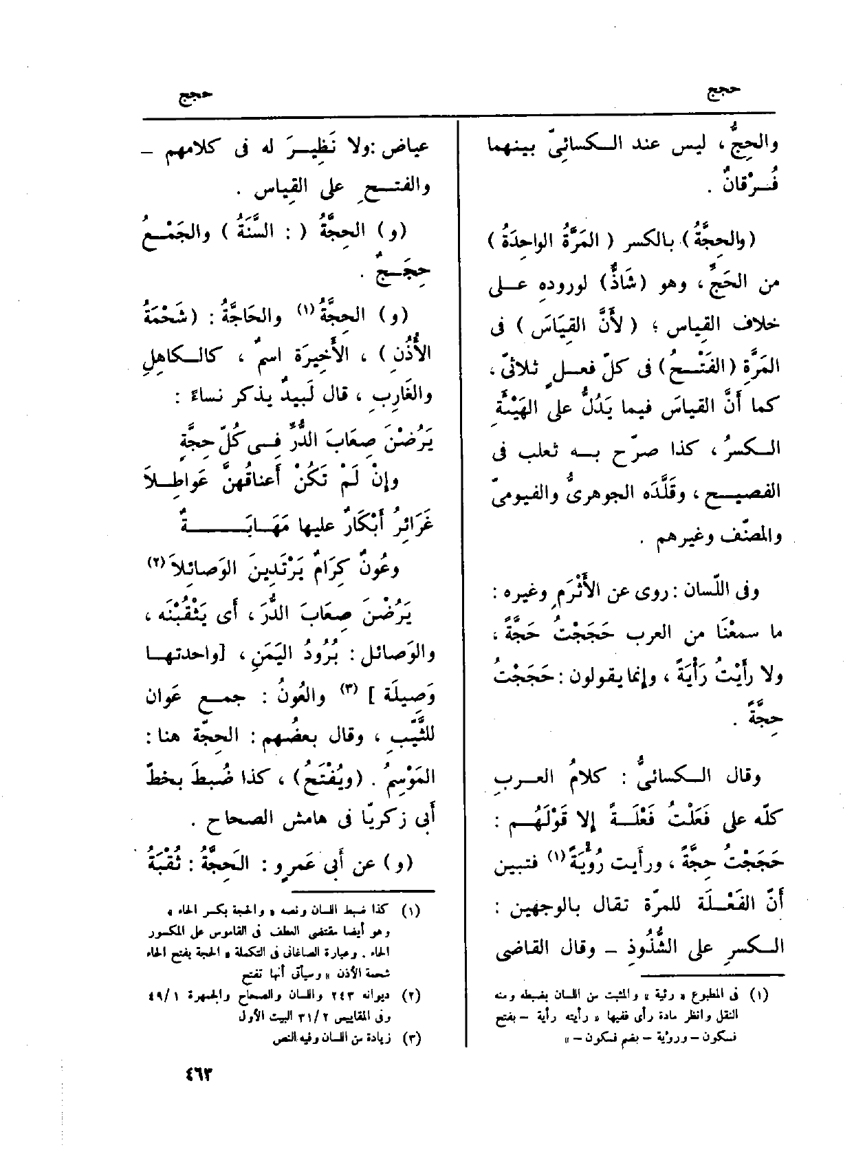 وَقَالَ الكسائيُّ: كلامُ العربِ كلّه على فَعَلْتُ فَعْلَةً إِلا قَوْلَهُم: حَجَجْتُ حِجَّةً، ورأَيت رُؤْيَةً فَتبين أَنّ الفَعْلَة للمرّة تقال بِالْوَجْهَيْنِ: الكسرِ على الشُّذُوذِ وَقَالَ القَاضِي عِيَاض: وَلَا نَظِيرَ لَهُ فِي كَلَامهم والفتحِ على القِياس.