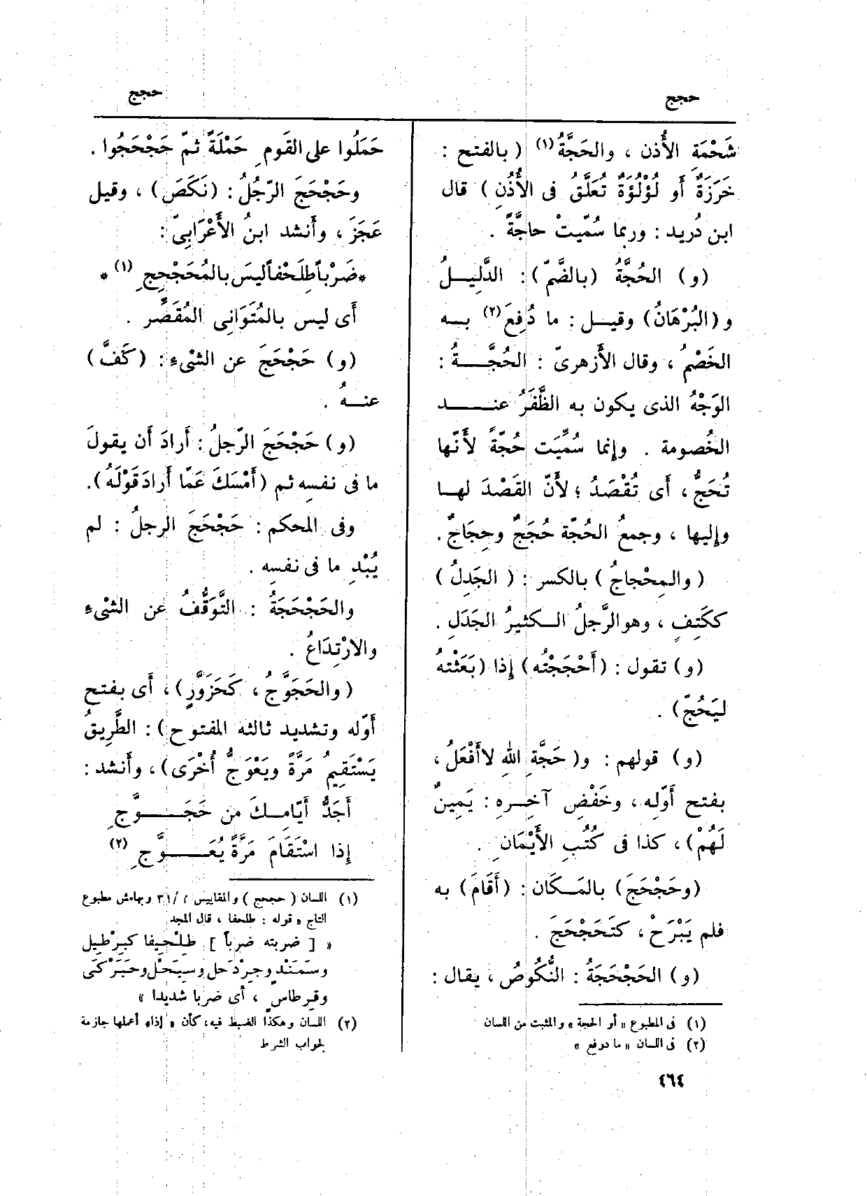 شَحْمَةِ الأُذن، والحَجَّةُ (بِالْفَتْح: خَرَزَةٌ أَو لُؤْلُؤَةٌ تُعَلَّقُ فِي الأُذُنِ) قَالَ ابْن دُريد: وَرُبمَا سُمّيتْ {حاجَّةً.