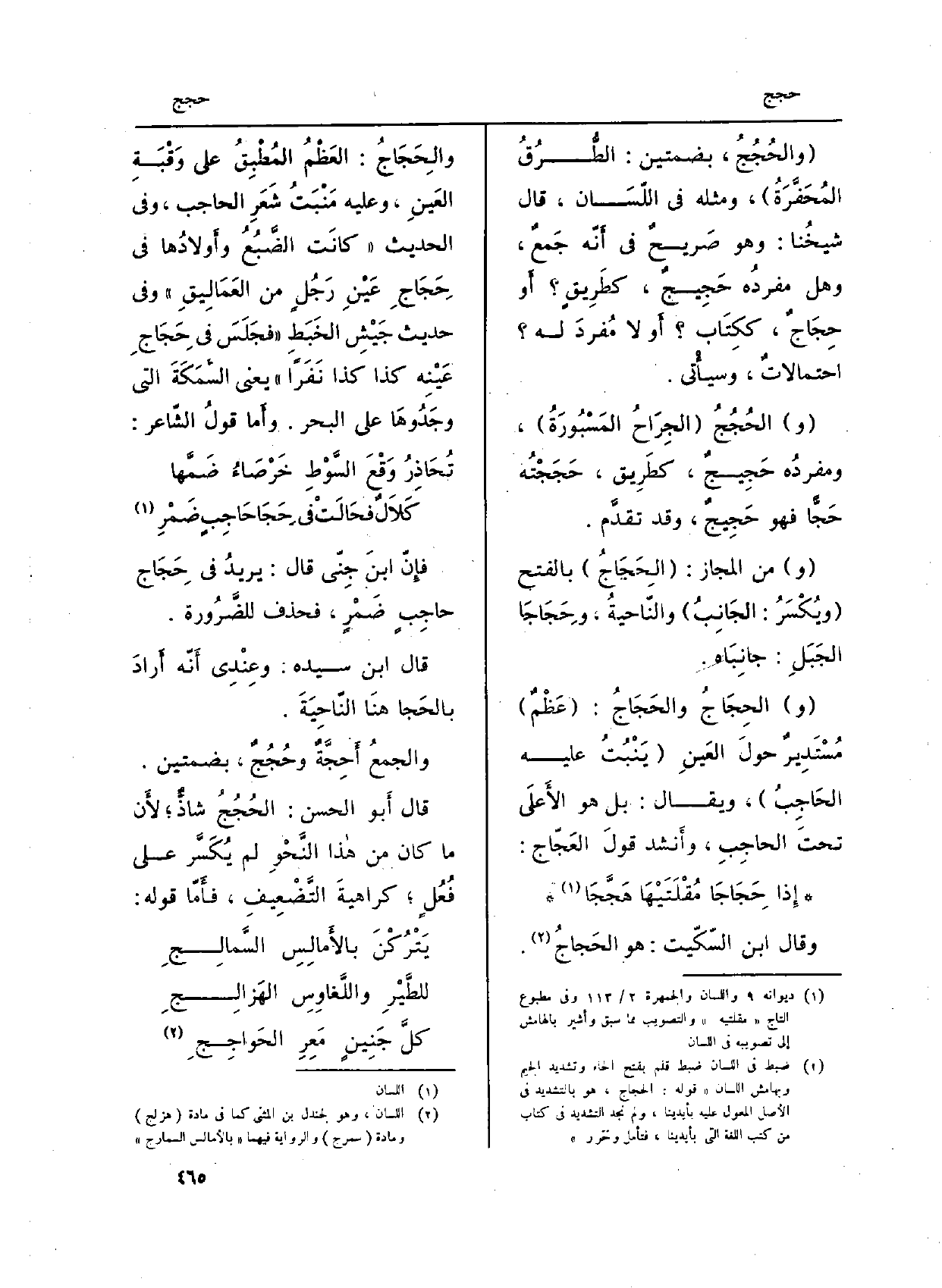 وَقَالَ ابْن السّكّيت: هُوَ} الحَجاجُ. والحَجَاجُ: العَظْمُ المُطْبِقُ على وَقْبَةِ العَينِ، وَعَلِيهِ مَنْبَتُ شَعَرِ الْحَاجِب، وَفِي الحَدِيث (كانَت الضَّبُعُ وأَولادُها فِي حَجَاجِ عَيْنِ رَجُلٍ من العَمَالِيقِ) وَفِي حَدِيث جَيْشِ الخَبَطِ (فجَلَسَ فِي حَجَاجِ عَيْنِه كَذَا كَذَا نَفَراً) يَعْنِي السَّمَكَةَ الَّتِي وجَدُوهَا على الْبَحْر. وأَما قولُ الشّاعر: