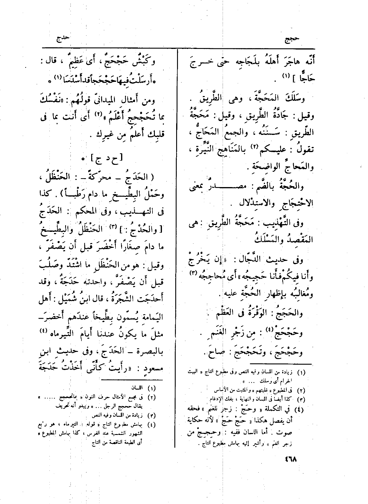 وسَلَكَ المَحَجَّةَ، وَهِي الطَّرِيقُ. وَقيل: جَادَّةُ الطَّرِيقِ، وَقيل: {مَحَجَّةُ الطّريقُ: سَنَنُه، والجمعُ} المَحَاجُّ، تقولُ: عَلَيْكُم بالمَنَاهِج النَّيِّرةِ، {والمَحاجِّ الواضِحَةِ.