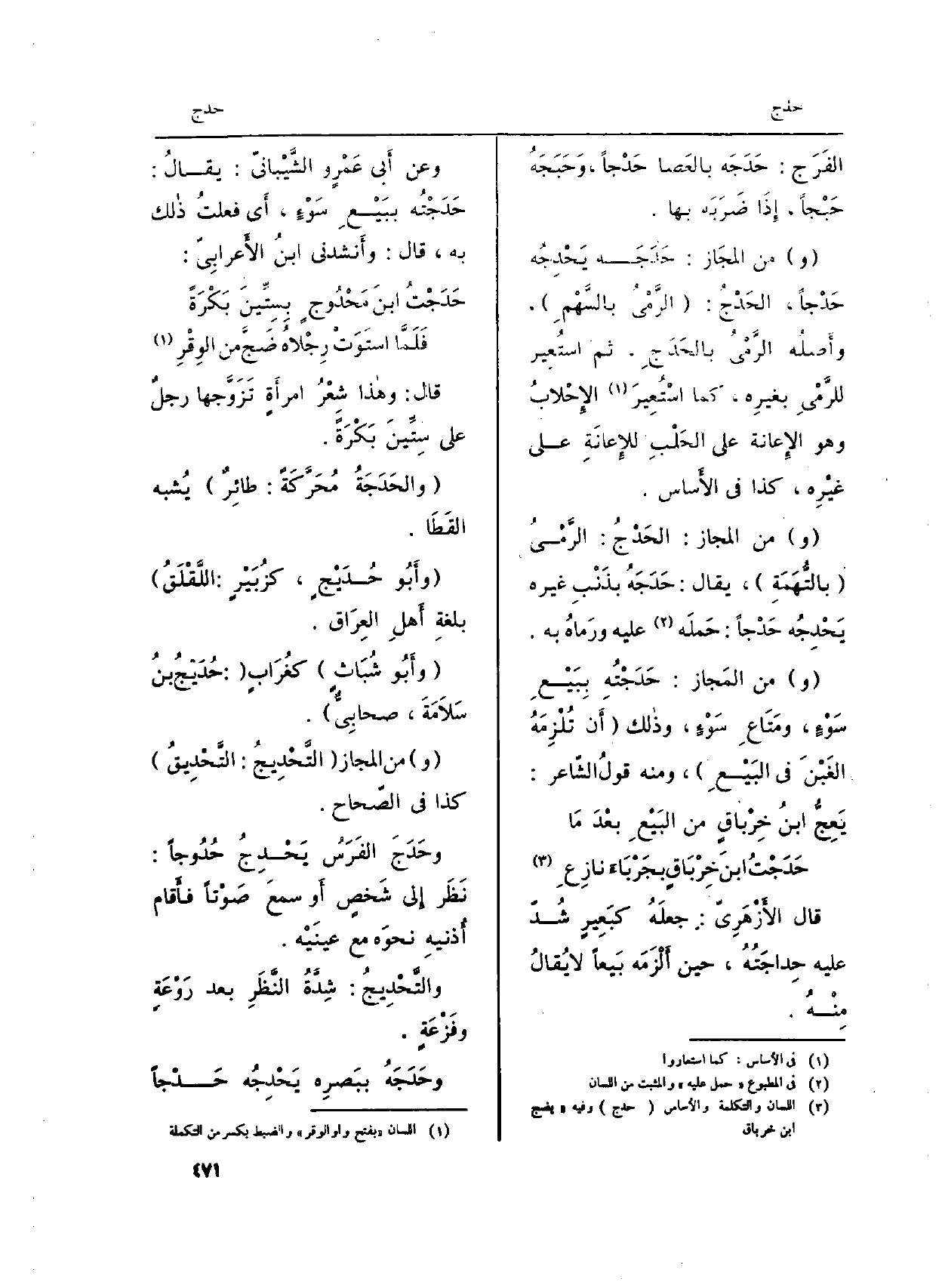 (و) من المجَاز: حَدَجَه يَحْدِجُه حَدْجاً، الحَدْجُ: (الرَّمْيُ بالسَّهْمِ) ، وأَصلُه الرَّمْيُ بالحَدَجِ، ثمَّ استُعِير للرَّمْيِ بغيرِه، كَمَا اسْتُعِير الإِحْلابُ وَهُوَ الإِعانة على الحَلْبِ للإِعانَةِ على غيْرِه، كَذَا فِي الأَساس.