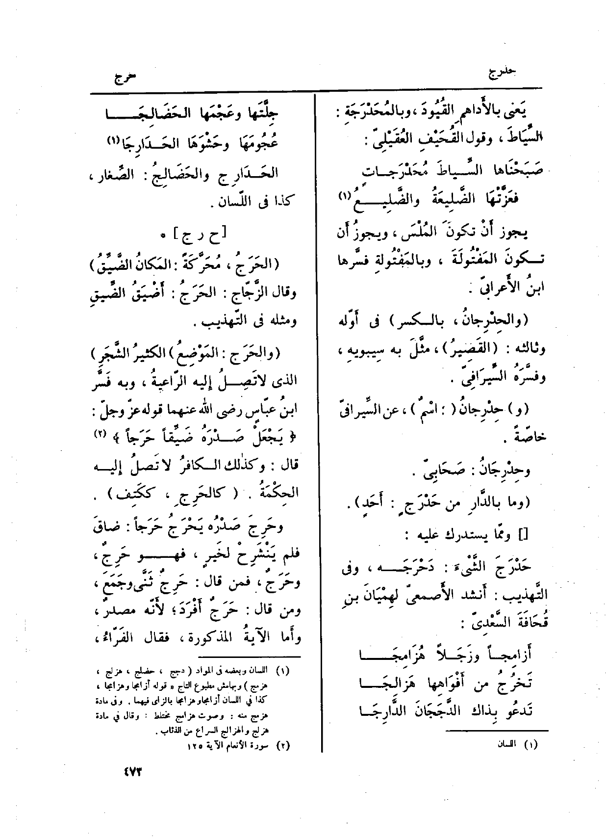 (والحَرَج: المَوْضِعُ) الكثيرُ (الشَّجَرِ) الَّذِي لَا تَصِلُ إِليه الرّاعيةُ، وَبِه فَسَّر ابنُ عبّاسٍ رَضِي الله عَنْهُمَا قَوْله عزّ وجلّ: {يَجْعَلْ صَدْرَهُ ضَيّقاً حَرَجاً} (سُورَة الْأَنْعَام، الْآيَة: 125) قَالَ: وكذالك الكافرُ لَا تَصلُ إِليه الحِكْمَةُ. (كالحَرِجِ، ككَتِف) .
