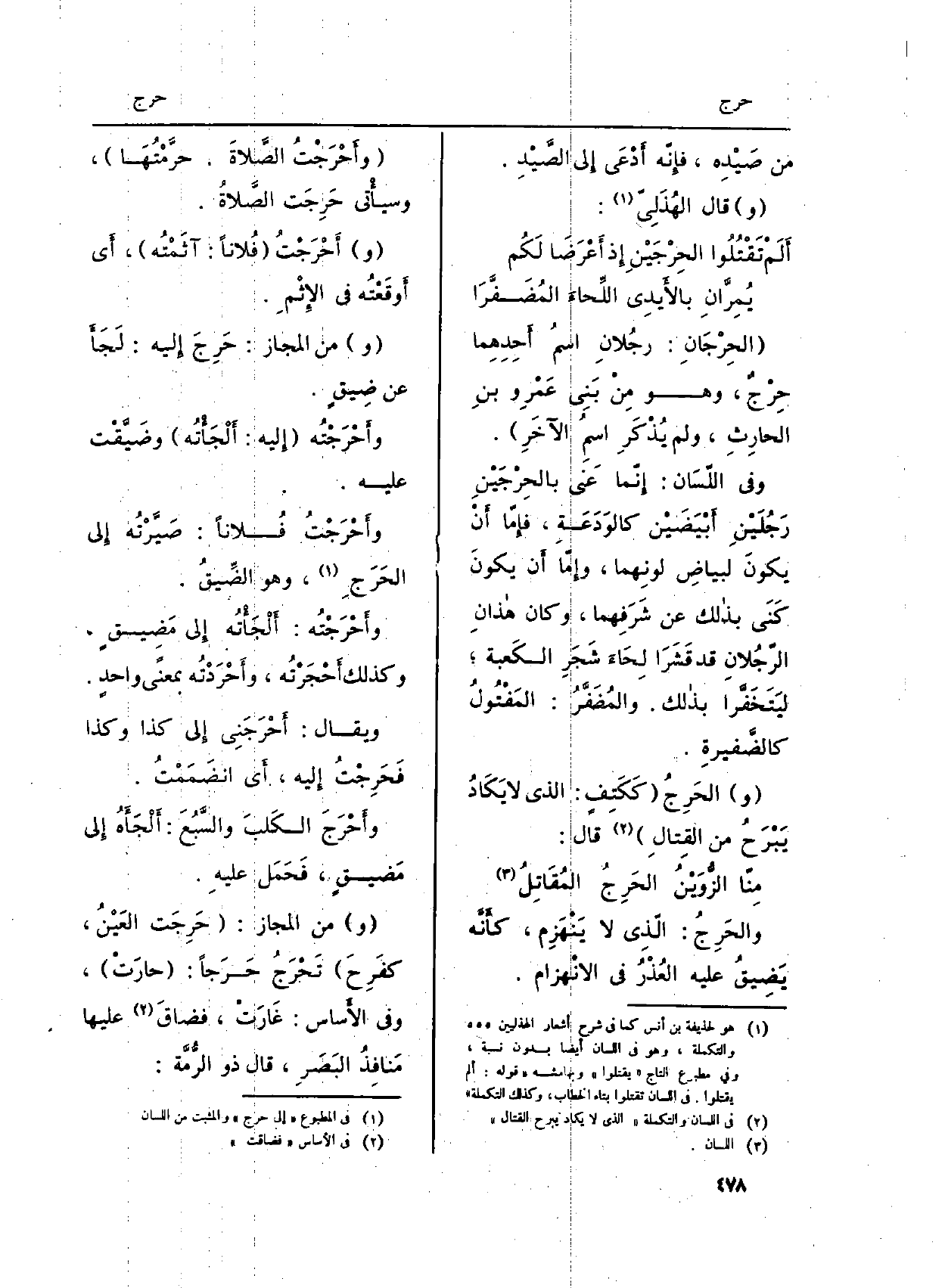 (الحِرْجَانِ: رجُلانِ اسمُ أَحِدِهِما حِرْجٌ، وَهُوَ مِنْ بَنِي عَمْرِو بنِ الحارِثِ، وَلم يُذْكَرِ اسمُ الآخَرِ) .
