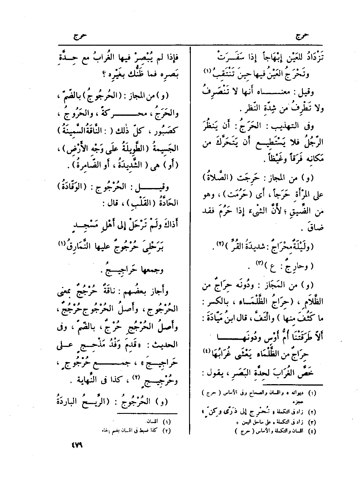 وأَجاز بعضُهم: ناقَةٌ حُرْجُجٌ بِمَعْنى الحُرْجُوج، وأَصلُ الحُرْجُوج حُرْجُجٌ، وأَصلُ الحُرْجُجِ حُرْجٌ، بالضّمّ، وَفِي الحَدِيث: (قَدِمَ وَفْدُ مَذْحِجٍ على حَرَاجِيجَ) ، جمع حُرْجُوجٍ، وحُرْجِيجٍ، كَذَا فِي النِّهاية.
