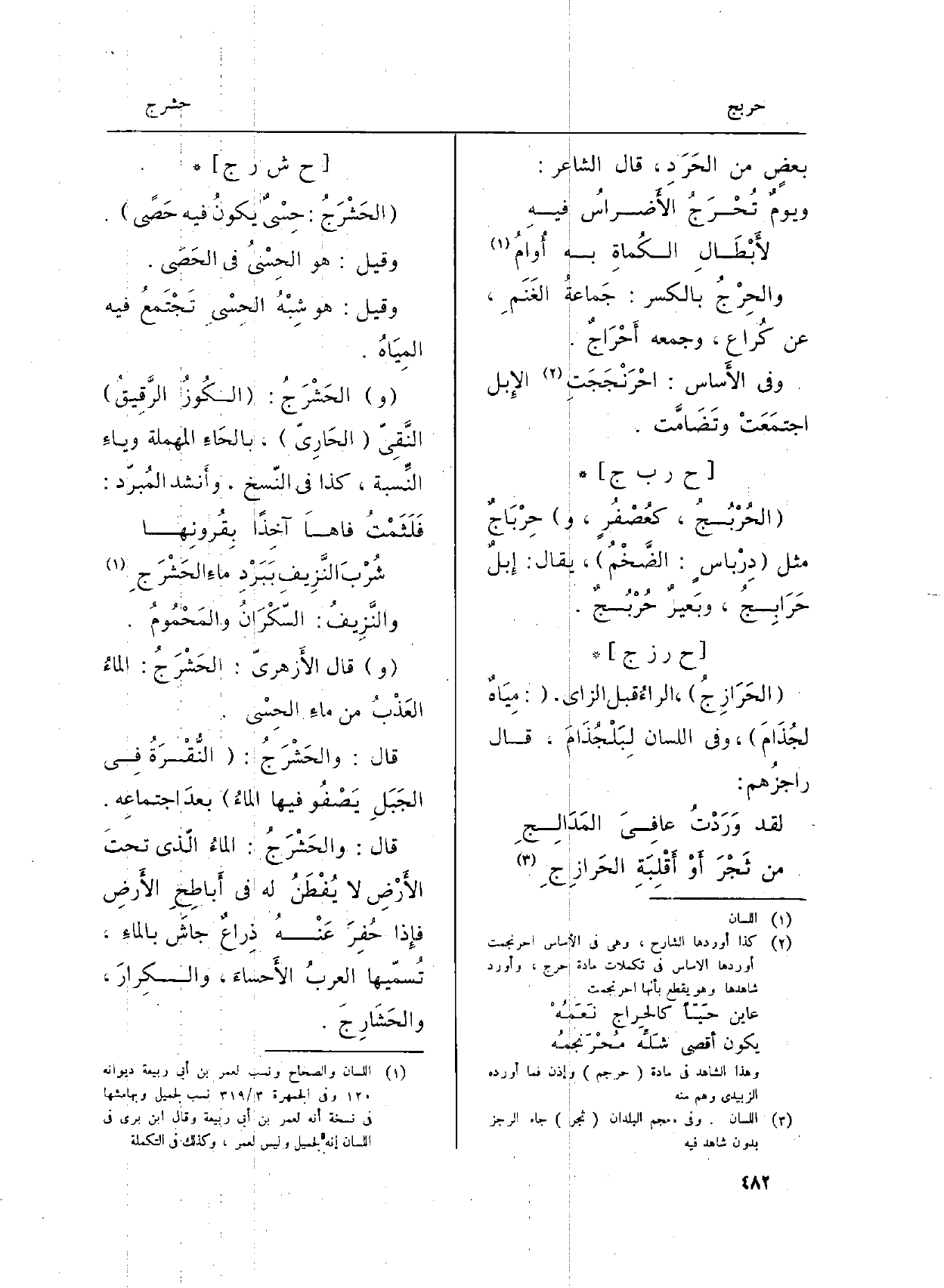 قَالَ: والحَشْرَجُ: الماءُ الّذي تحتَ الأَرْضِ لَا يُفْطَنخ لَهُ فِي أَباطِحِ الأَرضِ فإِذا حُفِرَ عَنْهُ ذِراعٌ جاشَ بالماءِ، تُسمّيها العربُ الأَحساءَ، والكِرارَ، والحَشَارِجَ.