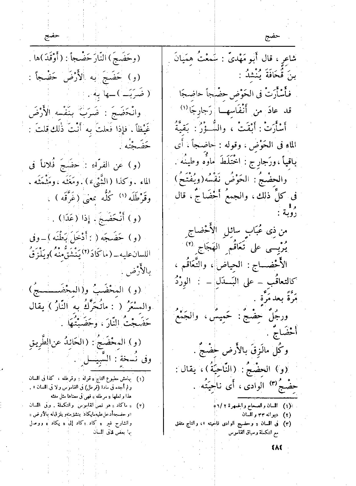 الأَحْضاج: الحِياض، والتَّعَاقُم، كالتعاقُبِ على البَدَلِ: الوِرْدُ مَرَّةً بعد مَرَّةٍ.
