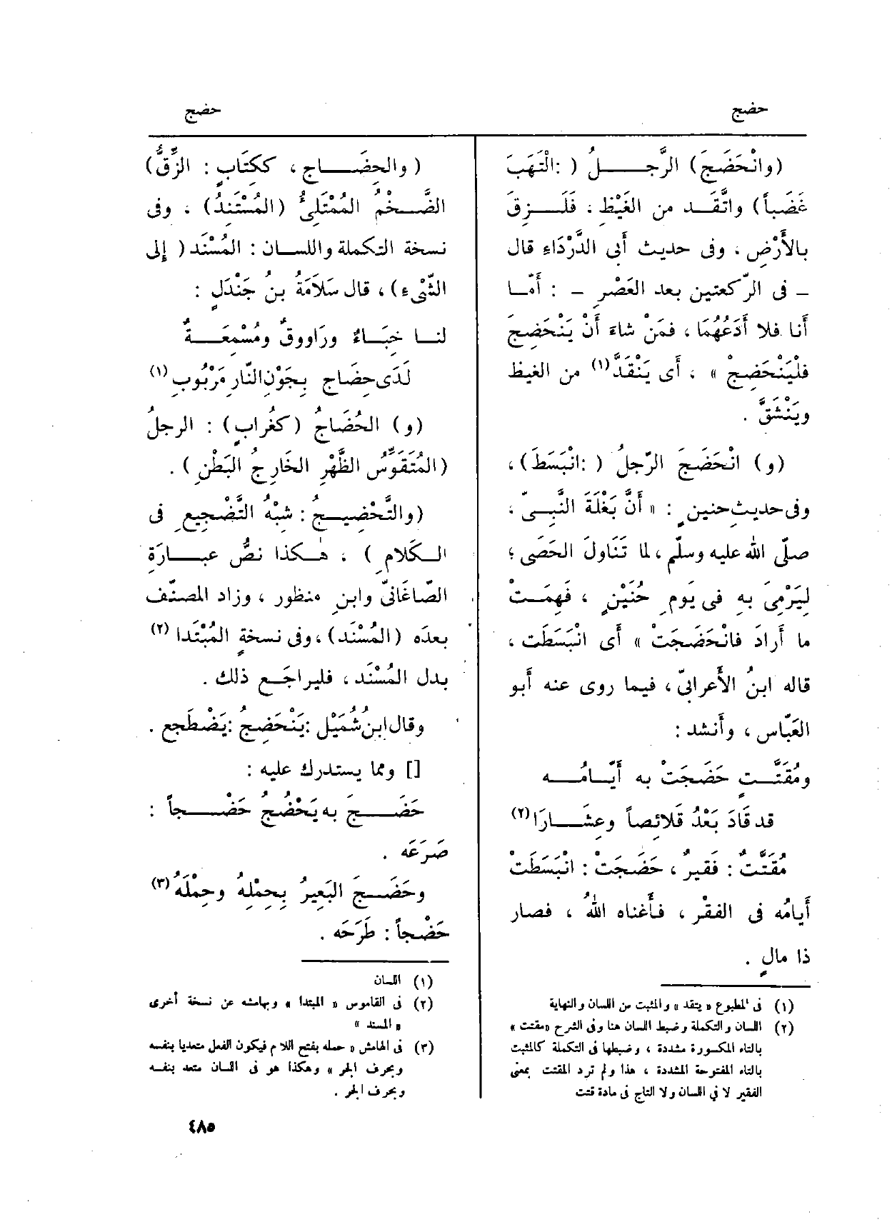 (والحِضَاج، ككِتَابٍ: الزِّقُّ) الضَّخْمُ المُمْتَلِىءُ (المُسْتَنِدُ) ، وَفِي نُسْخَة التكملة وَاللِّسَان: المُسْنَد (إِلى الشّيْءِ) ، قَالَ سَلاَمَةُ بنُ جَنْدَل: