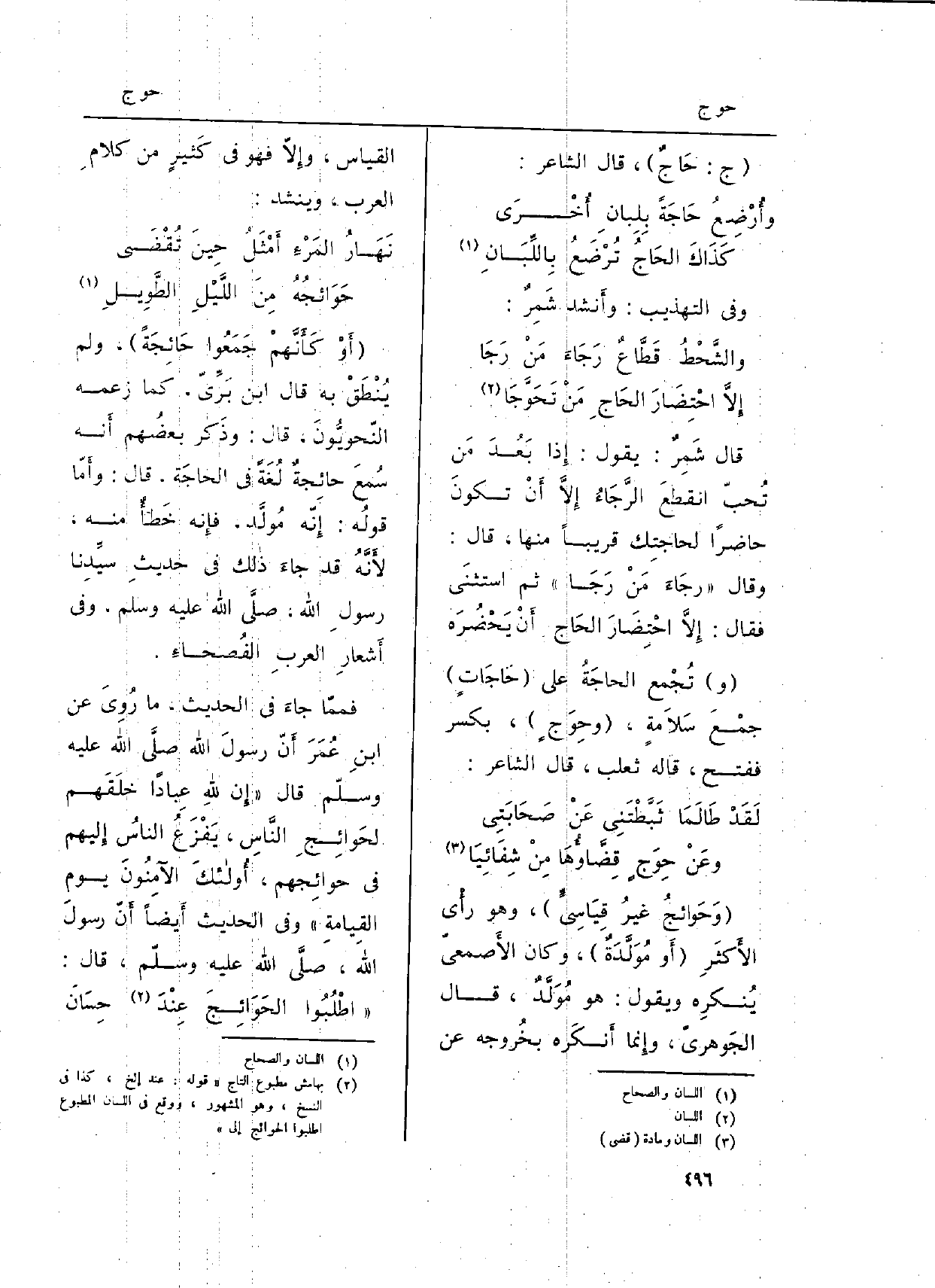 ( {وَحَوائجُ غيرُ قِيَاسِيَ) ، وَهُوَ رأْي الأَكثَرِ (أَو مُوَلَّدَةٌ) ، وَكَانَ الأَصمعيّ يُنكرِه وَيَقُول: هُوَ مُوَلَّدٌ، قَالَ الجَوهريّ، وانما أَنكَره بخُروجه عَن الْقيَاس، وإِلاّ فَهُوَ فِي كَثيرٍ من كلامِ الْعَرَب، وينشد: