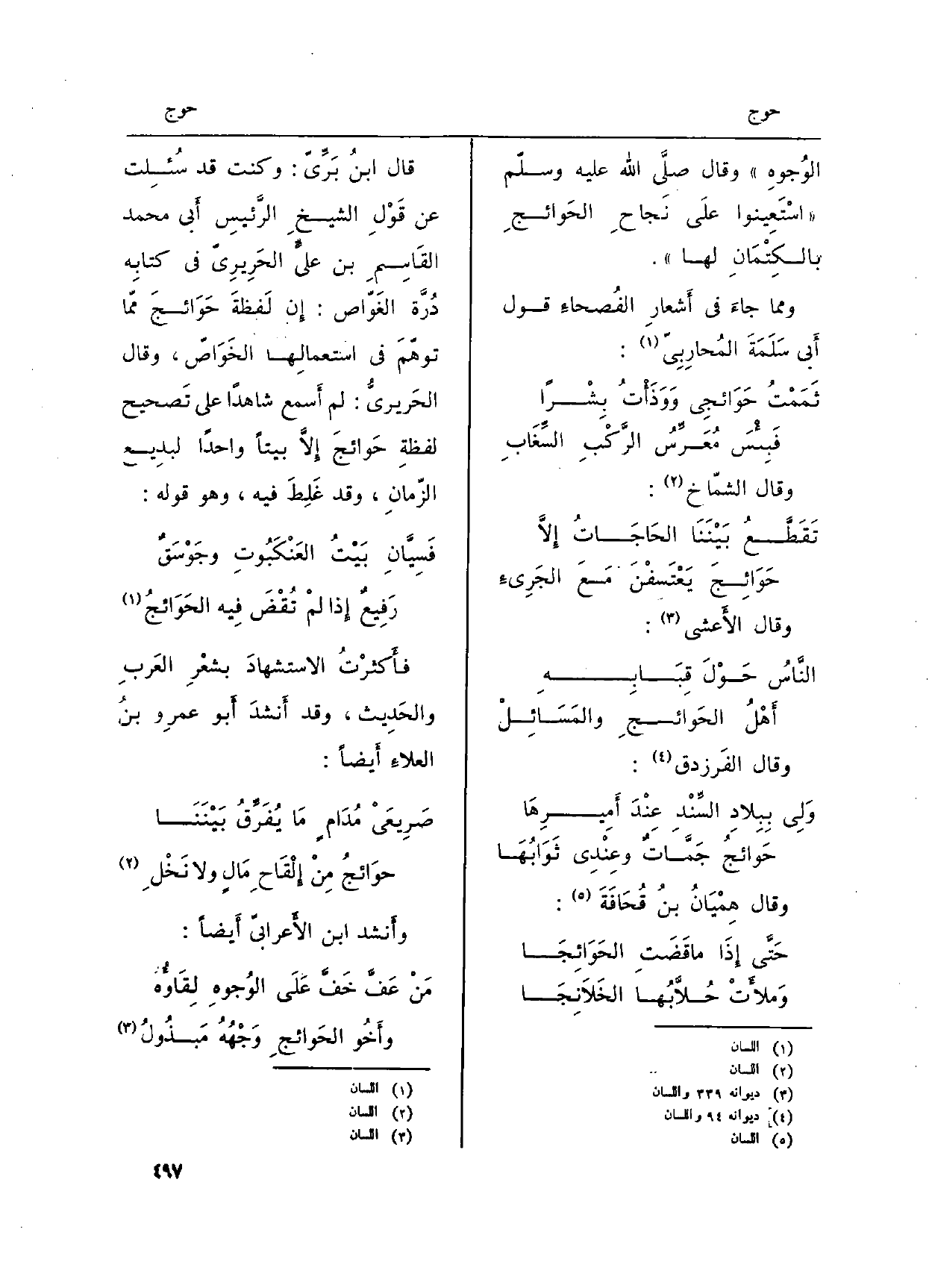 قَالَ ابنُ بَرِّيّ: وَكنت قد سُئلِت عَن قَوْله الشيخِ الرَّئِيس أَبي مُحَمَّد القَاسِمِ بن عليَ الحَرِيرِيّ فِي كتابِه دُرَّة الغَوّاص: إِن لَفظةَ حَوَائجَ ممّا توهّمَ فِي استعمالِها الخَوَاصّ، وَقَالَ الحَريريّ: لم أَسمع شَاهدا على تَصحيح لفظةِ حَوائجَ إِلاَّ بَيْتا وَاحِدًا لبدِيع الزّمانِ، وَقد غَلِطَ فِيهِ، وَهُوَ قَوْله: فَسِيَّانِ بَيْتُ العَنْكَبُوتِ وحَوْسَقٌ