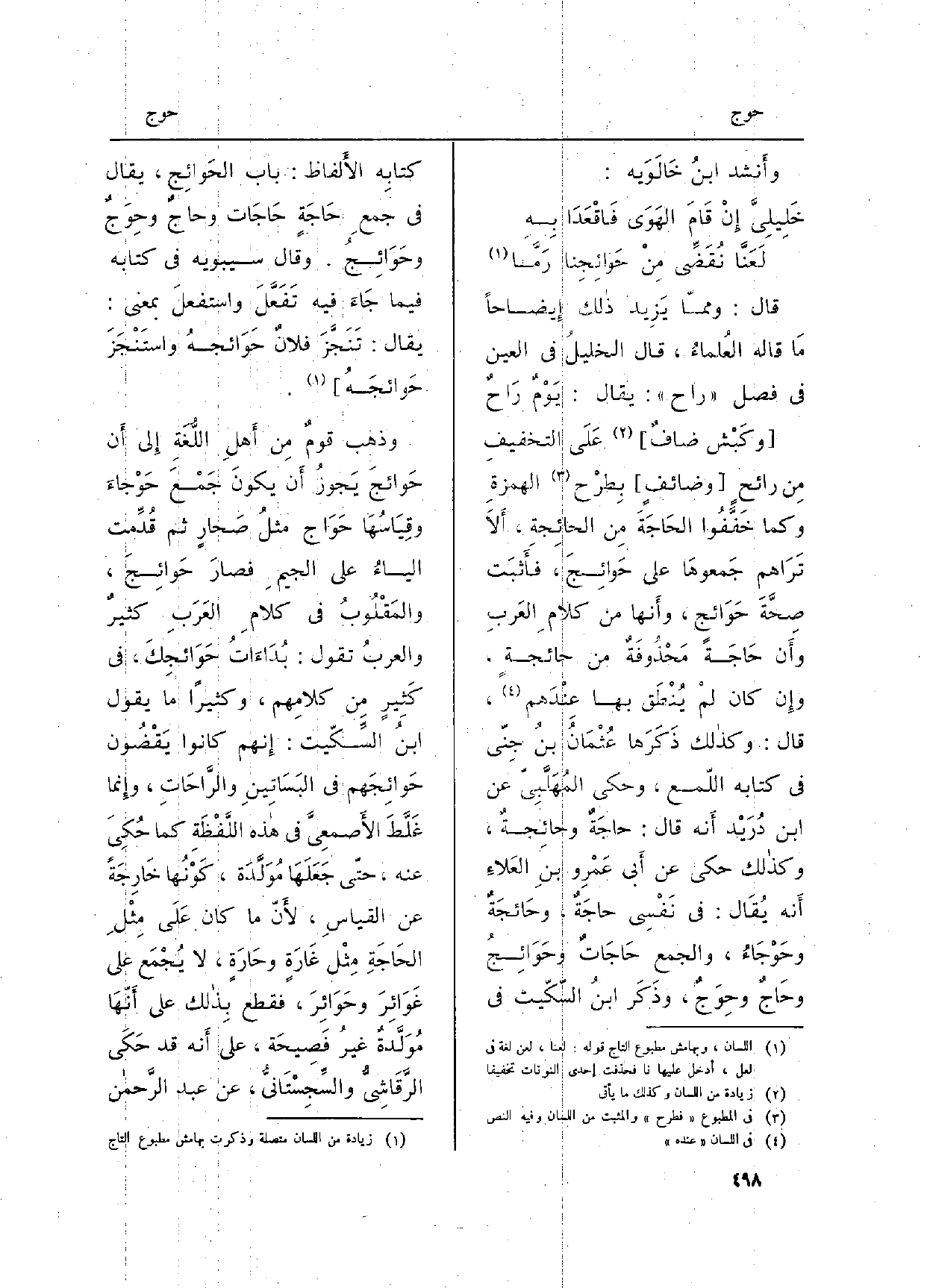 وَذهب قومٌ مِن أَهلِ اللُّغَةِ إِلى أَن حَوائجَ يَجوزُ أَن يكونَ جَمْعَ {حَوْجاءَ وقِيَاسُها حَوَاج مثل صَحارٍ ثمَّ قُدِّمت الياءُ على الجيمِ فصارَ حَوائِجَ، والمَقْلُوبُ فِي كلامِ العَرَبِ كثيرٌ والعربُ تَقول: بُدَاءَاتُ} حَوَائِجِكَ، فِي كَثِيرٍ من كلامِهم، وَكَثِيرًا مَا يَقُول ابنُ السِّكّيت: إِنهم كَانُوا يَقْضُون! حَوائِجَهم فِي البَسَاتِينِ والرَّاحَات، وإِنما غَلَّطَ الأَصمعيَّ فِي هاذا اللَّفْظَة كَمَا حُكِيَ عَنهُ، حَتَّى جَعَلَها مُوَلَّدَة، كَوْنُها خَارِجَةً عَن القياسِ، لأَنّ مَا كَانَ عَلَى مِثْلِ الحَاجَةِ مِثْل غَارَة وحَارَةِ، لَا يُجْمَع على غَوَائِرَ وحَوَائِرَ، فَقطع بِذالك على أَنّها مُوَلَّدةٌ غيرُ فَصِيحَة، على أَنه قد حَكَى الرَّقَاشي والسِّجْسْتَانيُّ، عَن عبد الرَّحمان