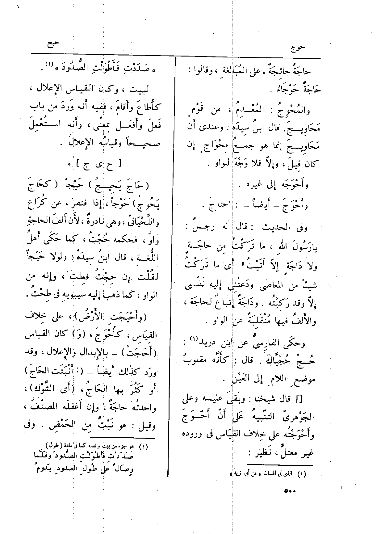 : (} حَاجَ {يَحِيجُ) } حَيْجاً ( {كحَاجَ يَحُوجُ) حَوْجاً، إِذا افْتقر، عَن كُرَاع واللِّحْيَانيّ، وَهِي نادرةٌ، لأَن أَلفَ الحاجةِ واوٌ، فَحكمه حُجْتُ، كَمَا حَكَى أَهلُ اللُّغةِ، قَالَ ابنُ سِيدَهْ: وَلَوْلَا} حَيْجاً لقُلْت إِن حِجْتُ فعِلت، وإِنه من الْوَاو، كَمَا ذهب إِليه سِيبَوَيْهٍ فِي طِحْتُ.