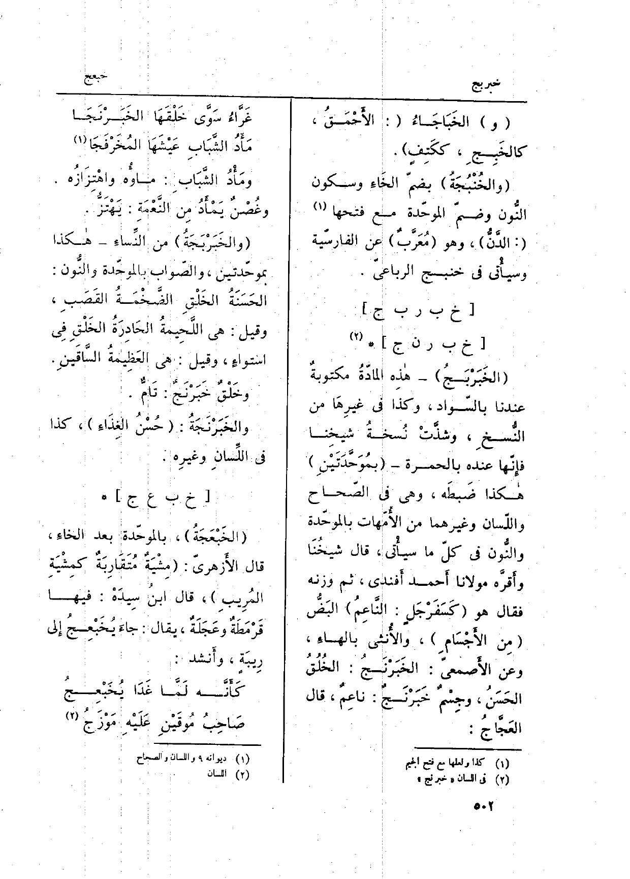 : (الخَبَرْبَجُ) هاذه المادّةُ مكتوبةٌ عندنَا بالسّواد، وَكَذَا فِي غيرِهَا من النُّسخِ، وشذَّتْ نُسخةُ شيخِنا فإِنّها عِنْده بالحمرة (بمُوَحَّدَتَيْنِ) هاكذا ضَبطَه، وَهِي فِي الصّحاح واللّسان وَغَيرهمَا من الأُمّهات بالموحّدة والنُّون فِي كلّ مَا سيأْتي، قَالَ شيخُنَا وأَقرَّه مَوْلَانَا أَحمد أَفندي، ثمَّ وَزنه فَقَالَ لَهو (كَسَفَرْجَلٍ: النَّاعِمُ) البَضُّ (من الأَجْسَامِ) ، والأُنثى بالهاءِ، وَعَن الأَصمعيّ: الخَبَرْنَجُ: الخُلُقُ الحَسَنُ، وجِسْمٌ خَبَرْنَجٌ: ناعِمٌ، قَالَ العَجَّاجُ: