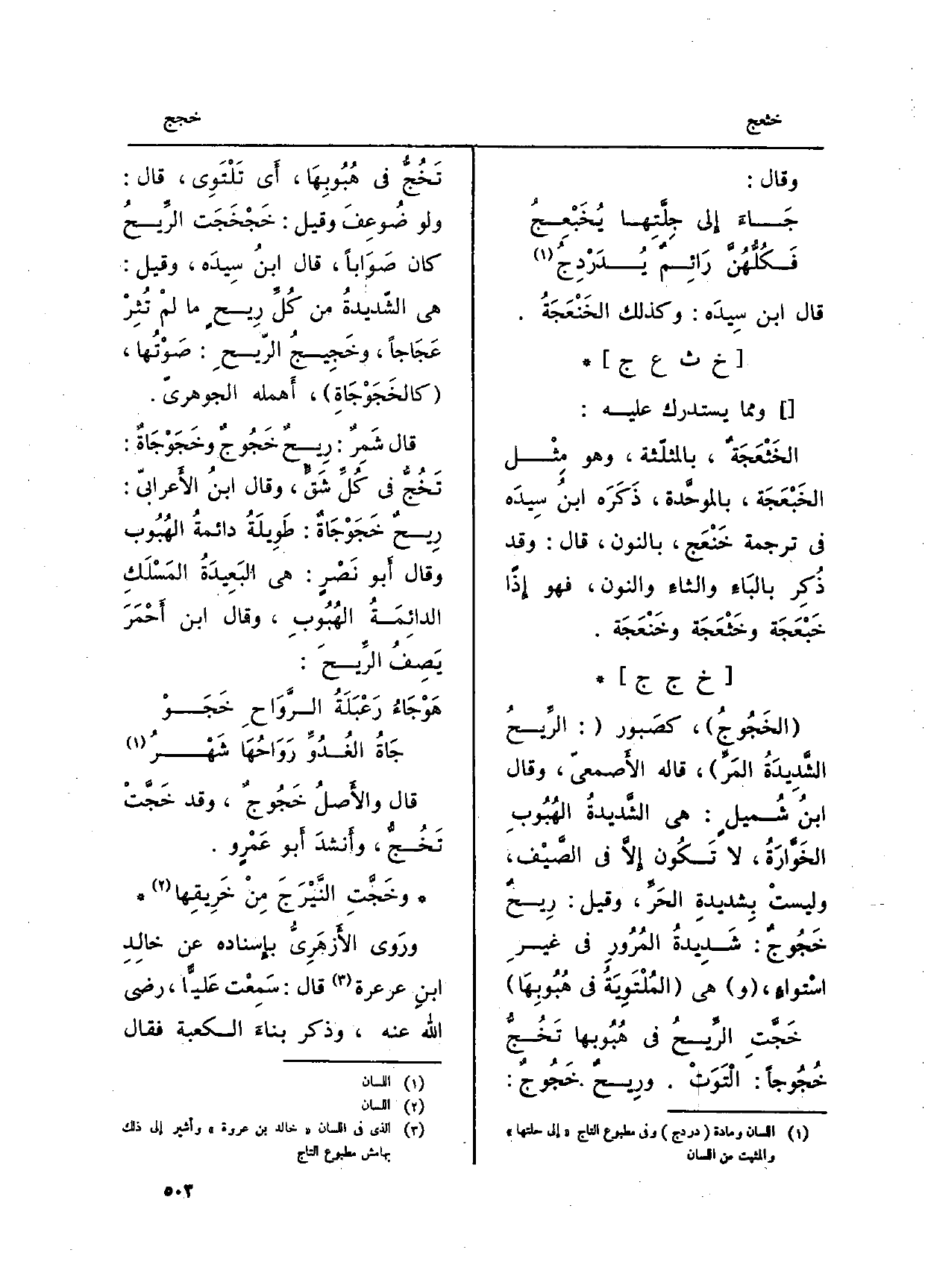 قَالَ شَمِرٌ: رِيحٌ {خَجُوجٌ} وخَجَوْجَاةٌ: {تَخُجُّ فِي كُلِّ شَقَ، وَقَالَ ابنُ الأَعرابيّ: رِيحٌ} خَجَوْجَاةٌ: طَوِيلَةُ دائمةُ الهُبُوب وَقَالَ أَبو نَصْرٍ: هِيَ البَعِيدَةُ المَسْلَكِ الدائِمَةُ الهُبُوبِ، وَقَالَ ابْن أَحْمَرَ يَصِفُ الرِّيحَ: