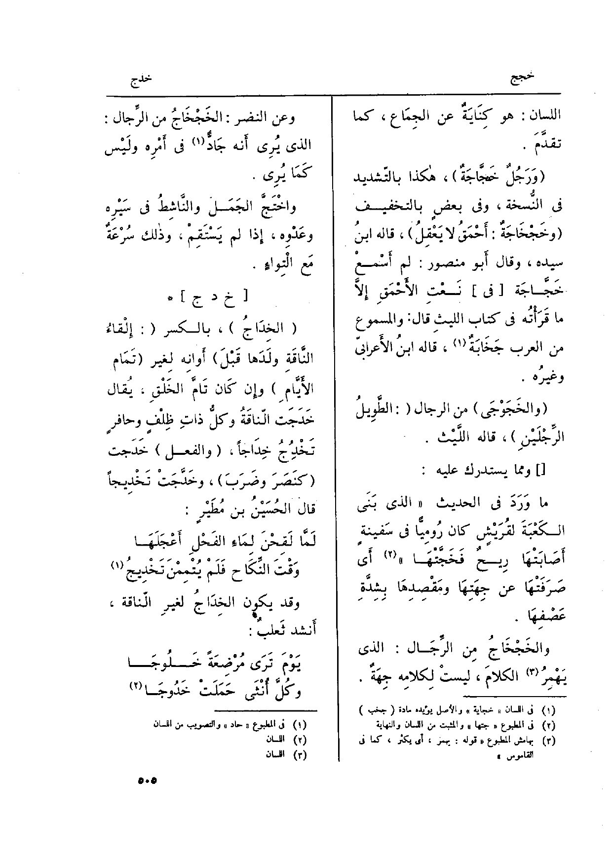 {والخَجْخَاجُ مِن الرِّجَال: الَّذِي يَهْمِرُ الكلامَ، ليستْ لِكلامِه جِهَةٌ.