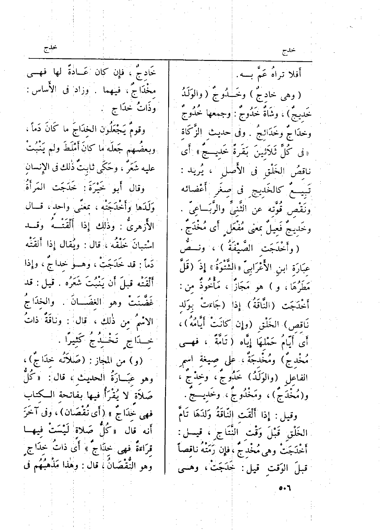 (وَهِي خادِجٌ) وخَدُوجٌ (والوَلَدُ خَدِيجٌ) ، وشَاةٌ خَدُوجٌ: وَجَمعهَا خُدوجٌ وخدَاجٌ وخَدَائِجُ. وَفِي حديثِ الزَّكَاةِ (فِي كُلِّ ثَلاَثِينَ بَقَرَةً خَدِيجٌ) أَي ناقِصُ الخَلْقِ فِي الأَصلِ، يُريد: تَبِيعٌ كالخَدِيجِ فِي صِغَرِ أَعْضائه ونَقْصِ قُوَّتِه عَن الثَّنِيِّ والرَّبَاعِيّ. وخَديجٌ فَعِيلٌ بِمَعْنى مُفْعَلٍ أَي مُخْدَجٌ.