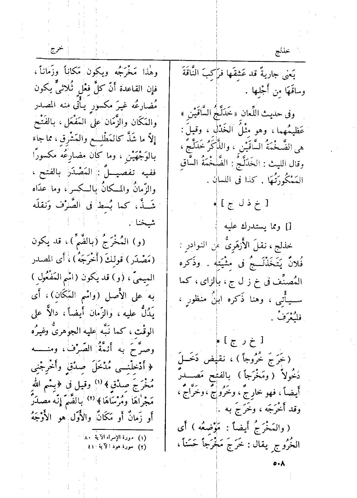 (و) المُخْرَجُ (بالضَّمِّ) ، قد يكون (مَصْدَر) قولِكَ (أَخْرَجَهُ) ، أَي الْمصدر المِيميّ. (و) قد يكون (اسْم المَفْعُولِ) بِهِ على الأَصل (واسْم المَكَانِ) ، أَي يَدُلُّ عَلَيْهِ، والزّمان أَيضاً، دالاًّ على الوقْتِ، كَمَا نَبَّه عَلَيْهِ الجوهريُّ وغيرُه وصرَّحَ بِهِ أَئمَّةُ الصّرْف، وَمِنْه {أَدْخِلْنِى مُدْخَلَ صِدْقٍ وَأَخْرِجْنِى مُخْرَجَ صِدْقٍ} (سُورَة الْإِسْرَاء، الْآيَة: 80) وَقيل فِي {5. 044 بِسم امجراها وَمرْسَاهَا} (سُورَة هود، الْآيَة: 41) بالضَّمّ إِنّه مصدَرٌ أَو زَمانٌ أَو مَكَانٌ والأَوّل هُوَ الأَوْجَهُ