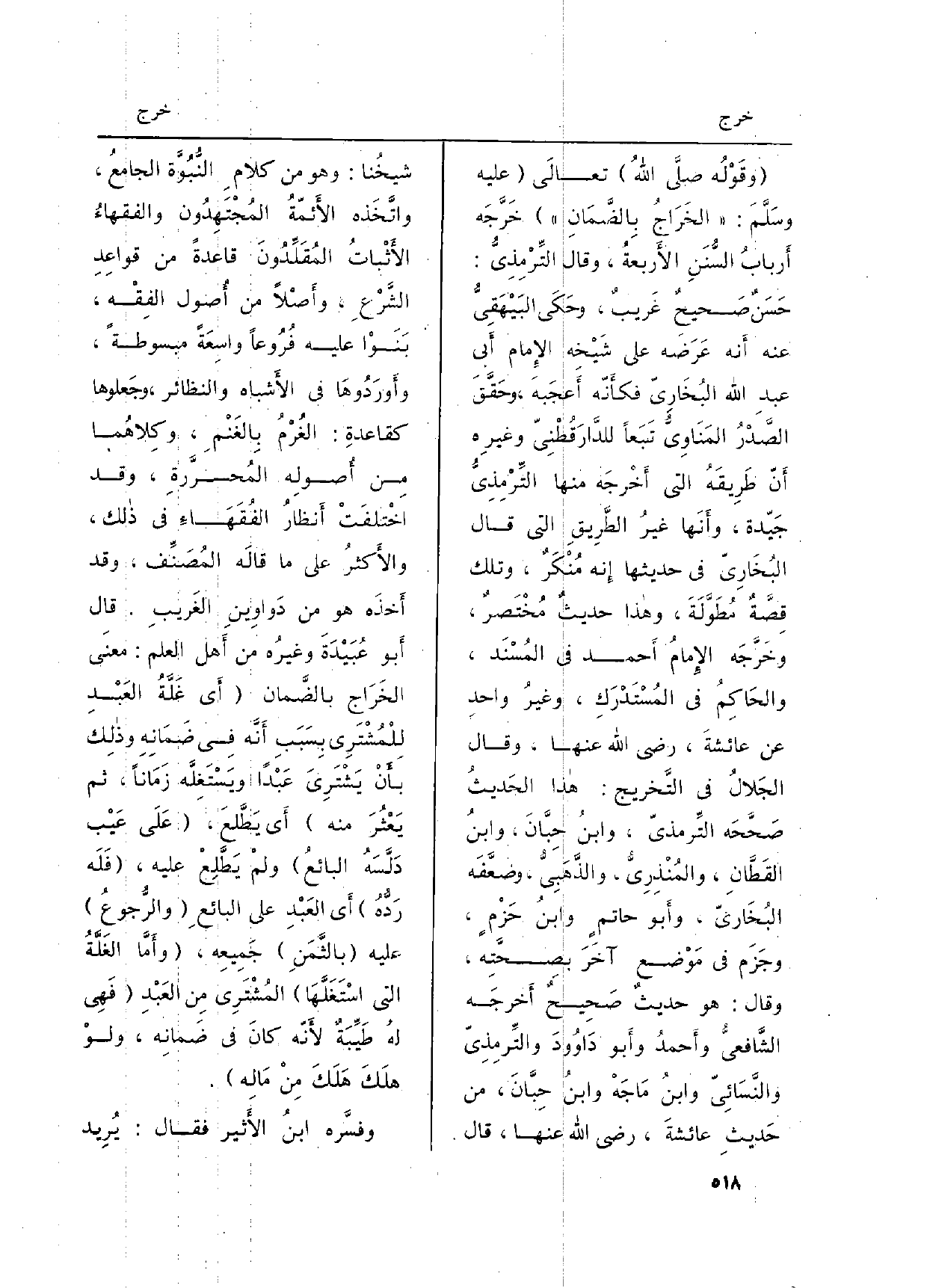 (وقَوْلُه صلَّى الله) تعالَى (عَلَيْهِ وسَلَّمَ: (الخَرَاجُ بِالضَّمَانِ)) خَرَّجَه أَربابُ السُّنَنِ الأَربعةُ، وَقَالَ التِّرْمِذِيُّ: حَسَنٌ صَحيحٌ غَريبٌ، وحَكَى البَيْهَقِيُّ عَنهُ أَنه عَرَضَه على شَيْخِه الإِمام أَبي عبدِ الله البُخَارِيّ فكأَنْه أَعجَبهَ، وحَقَّقَ الصَّدْرُ المَنَاوِيُّ تَبَعاً للدَّارَقُطْنِيّ وغيرِه أَنّ طَرِيقَهُ الَّتِي أَخْرجَه مِنْهَا التِّرْمِذِيُّ جَيّدة، وأَنَها غيرُ الطَّرِيقِ الَّتِي قَالَ البُخَارِيّ فِي حَدِيثهَا إِنه مُنْكَرٌ، وَتلك قِصَّةٌ مُطَوَّلَةَ، وهاذا حديثٌ مُخْتَصرٌ، وخَرَّجَه الإِمامُ أَحمد فِي المُسْنَد، والحَاكِمُ فِي المُسْتَدْرَكِ، وغيرُ واحدِ عَن عائشةَ، رَضِي الله عَنْهَا، وَقَالَ الجَلالُ فِي التَّخريج: هاذا الحَديثُ صَحَّحَه التِّرمذيّ، وابنُ حِبَّانَ، وابنُ القَطَّانِ، والمُنْذِرِيُّ، والذَّهَبِيُّ، وضعَّفَه البُخَاريّ، وأَبو حاتمٍ وابنُ حَزْمٍ، وجَزَم فِي مَوْضع آخَرَ بصِحَّتِه، وَقَالَ: هُوَ حديثٌ صَحِيحٌ أَخرجَه الشَّافعيٌّ وأَحمدُ وأَبو دَاوُودَ والتِّرْمِذِيّ والنَّسَائِيّ وابنُ مَاجَهْ وابنُ حِبَّانَ، عَن حَديثِ عاشةَ، رَضِي الله عَنْهَا، قَالَ شيخُنا: وَهُوَ من كلامِ النُّبُوَّة الجامعُ، واتَّخَذه الأَئمّةُ المُجْتَهِدُون والفقهاءُ الأَثْباتُ المُقَلِّدُونَ قَاعِدَة من قواعِدِ الشَّرْعِ، وأَصْلاً من أُصول الفِقْه، بَنَوْا عَلَيْهِ فُرُوعاً واسِعَةً مبسوطةً، وأَورَدُوهَا فِي الأَشباه والنظائر، وجَعلوها كقاعدةِ: الغُرْمُ بِالغَنْمِ، وكِلاهُما مِن أُصوله المُحرَّرةِ، وَقد اخْتلفَتْ أَنظارُ الفُقَهَاءِ فِي ذالك، والأَكثرُ على مَا قالَه المُصَنِّف، وَقد أَخذَه هُوَ من دَواوِوينِ الغَريبِ. قَالَ أَبو عُبَيْدَةَ وغيرُه من أَهل الْعلم: معنَى الخَرَاج بالضَّمان (أَي غَلَّةُ العَبْدِ لِلْمُشْتَرِي بِسَبَبِ أَنَّه فِي ضَمَانِهِ وذالِكَ بأَنْ يَشْتَرِيَ عَبْداً ويَسْتَغِلَّه زَمَاناً، ثمَّ يَعْثُرَ مِنْهُ) أَي يَطَّلعَ، (عَلَى عَيْب دَلَّسَهُ البائعُ) ولمْ يَطَّلِعْ عَلَيْهِ، (فَلَه رَدُّهُ) أَي العَبْدِ على البائعِ (والرُّجوعُ) عَلَيْهِ (بالثَّمَنِ) جَمِيعِه، (وأَمَّا الغَلَّةُ الَّتِي اسْتَغَلَّهَا) المُشْتَرِي مِن العَبْدِ (فَهِي لهُ طَيِّبَةٌ لأَنّه كانَ فِي ضَمانِه، ولوْ هَلَكَ هَلَكَ مِنْ مَالِه) .