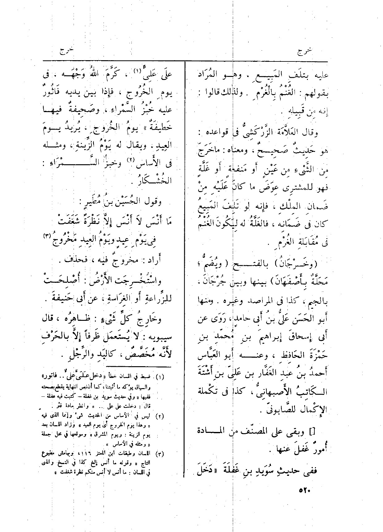 فَفِي حديثِ سُوَيدِ بنِ غَفلَةَ (دَخَلَ علَى عَلِيَ، كَرَّمَ الله وَجْهَه، فِي يومِ الخُرُوجِ، فإِذا بَين يَدَيْهِ فاثُورٌ عَلَيْهِ خُبْزُ السَّمْراءِ، وصَحِيفةٌ فِيهَا خَطيفَةٌ) يومُ الخُروجِ، يُريدُ يومَ العِيدِ، وَيُقَال لَهُ يَوحمُ الزِّينةِ، وَمثله فِي الأَساس وخبزُ السَّمْرَاءِ: الخُشْكَارُ.