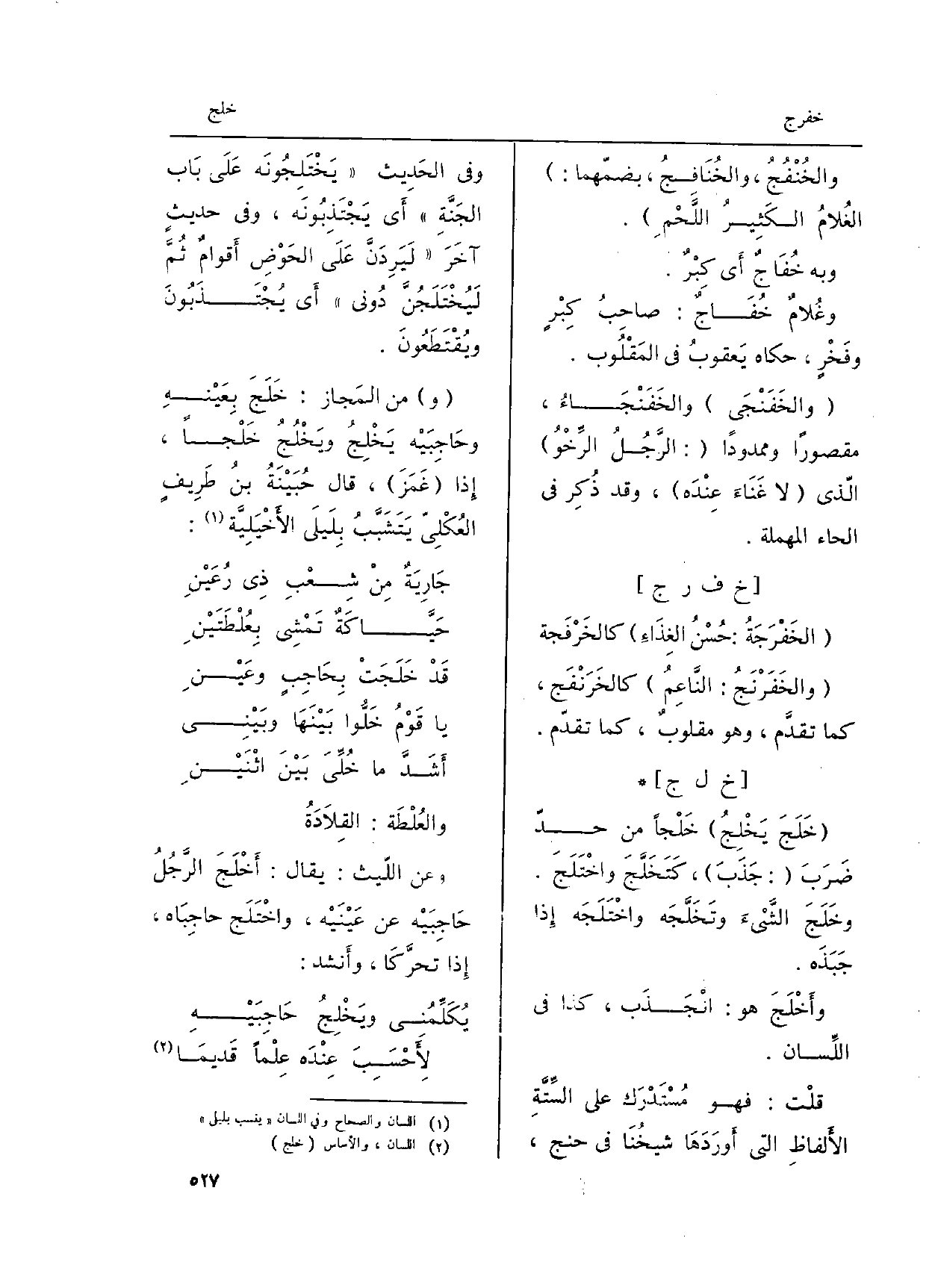 (و) من المَجاز: خَلَجَ بِعَيْنِهِ وحَاجَبِيَهْ يَخْلِجُ ويَخْلُجُ خَلْجاً، إِذا (غَمَزَ) ، قَالَ حُبَيْنَةُ بنُ طَرِيفٍ العُكْلِيّ يَتَشَبَّبُ بِلَيلَى الأَخْيَلِيَّة: