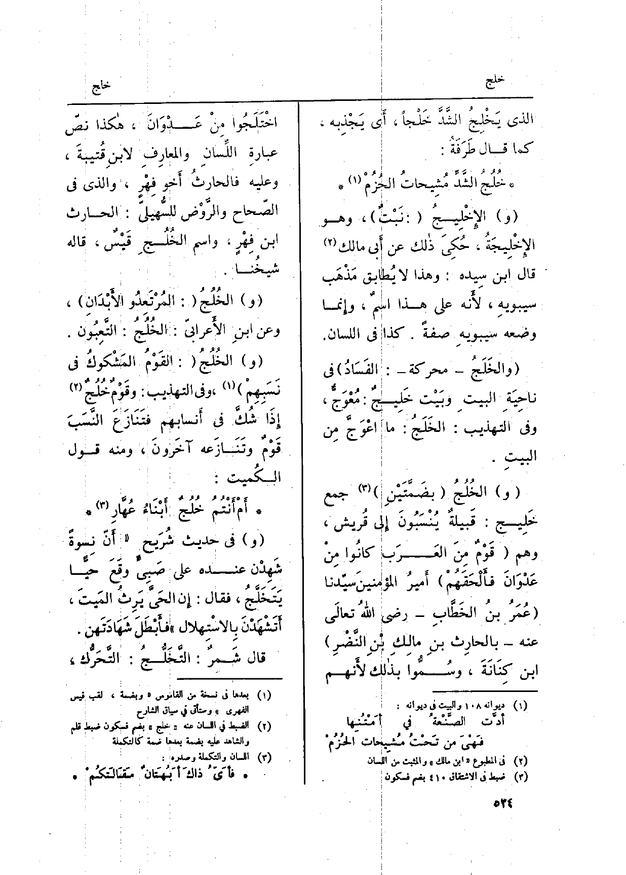 (و) الخُلُجُ (بضَمَّتَيْنِ) جمع خَلِيج: قَبيلةٌ يُنْسَبُونَ إِلى قرُيش، وهم (قَوْمٌ مِنَ العَرَب كانُوا مِنْ عَدْوَانَ فأَلْحَقَهُمْ) أَميرُ المؤمنينَ سيّدنا (عُمَرُ بنُ الخَطَّابِ رَضِي الله تعالَى عَنهُ بالحارِث بنِ مالِكِ بْنه النَّضْرِ) ابْن كِنَانَةَ، وسُمُّوا بذالك لأَنهم اخْتَلَجُوا مِنْ عَدْوَانَ، هاكذا نصّ عبارةِ اللِّسانه والمعارِفِ لابنِ قُتيبةَ، وَعَلِيهِ فالحارثُ أَخو فِهْرٍ، وَالَّذِي فِي الصّحاح والرَّوْض للُّهيليّ: الْحَارِث ابْن فِهْرٍ، وَاسم الخُلُجِ قَيْسٌ، قَالَه شيخُنا.