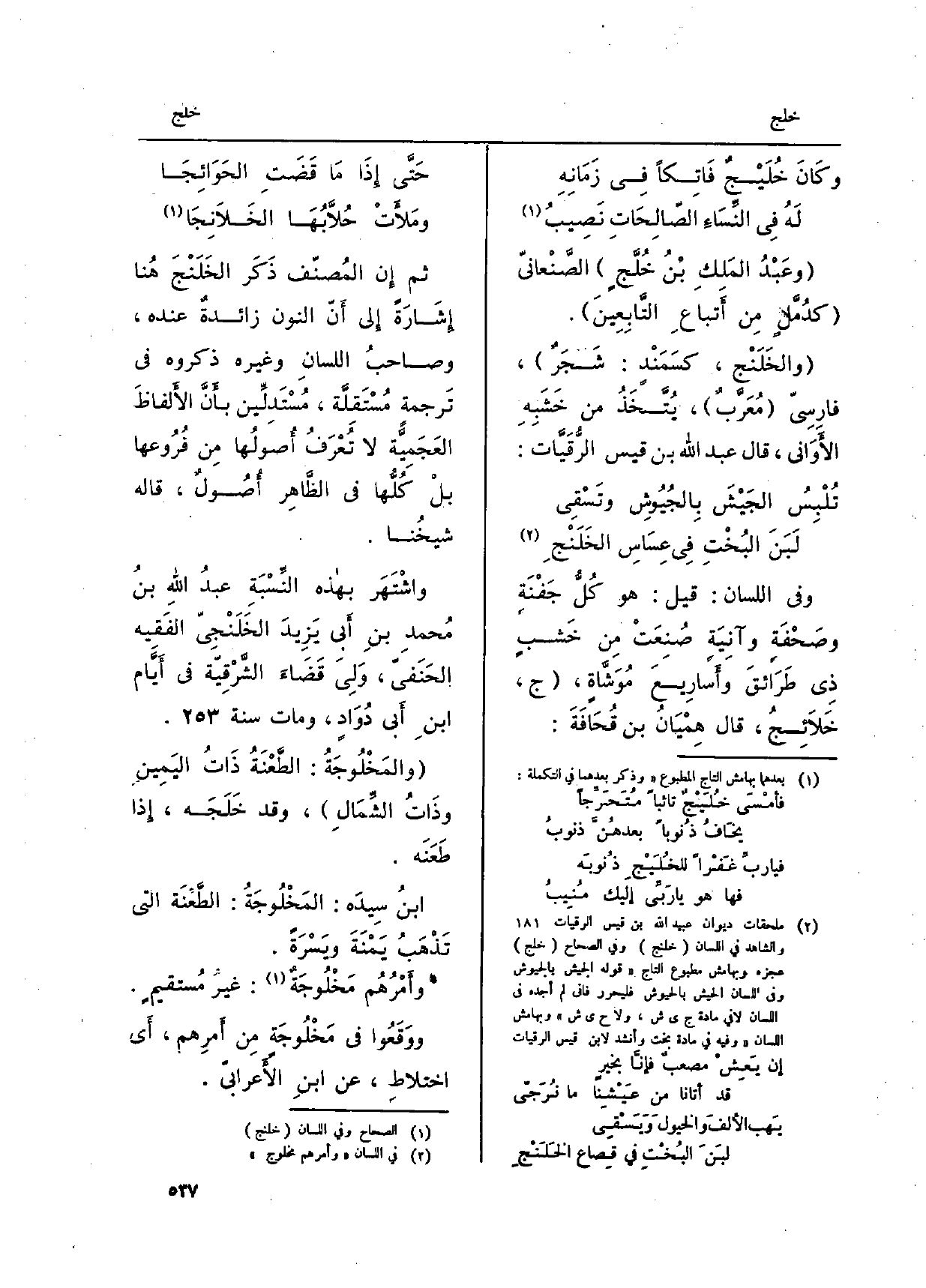 ثمَّ إِن المُصنّف ذَكَر الخَلَنْجَ هُنا إِشَارَةً إِلى أَنّ النُّون زائدةٌ عِنْده، وصاحبُ اللسانِ وَغَيره ذَكرُوهُ فِي تَرجمةٍ مُسْتَقِلَّة، مُسْتَدِلِّين بأَنَّ الأَلفاظَ العَجَمِيَّة لَا تُعْرَفُ أُصولُها مِن فُرُوعها بلْ كُلُّها فِي الظَّاهِر أُصُولٌ، قَالَه شيخُنا.