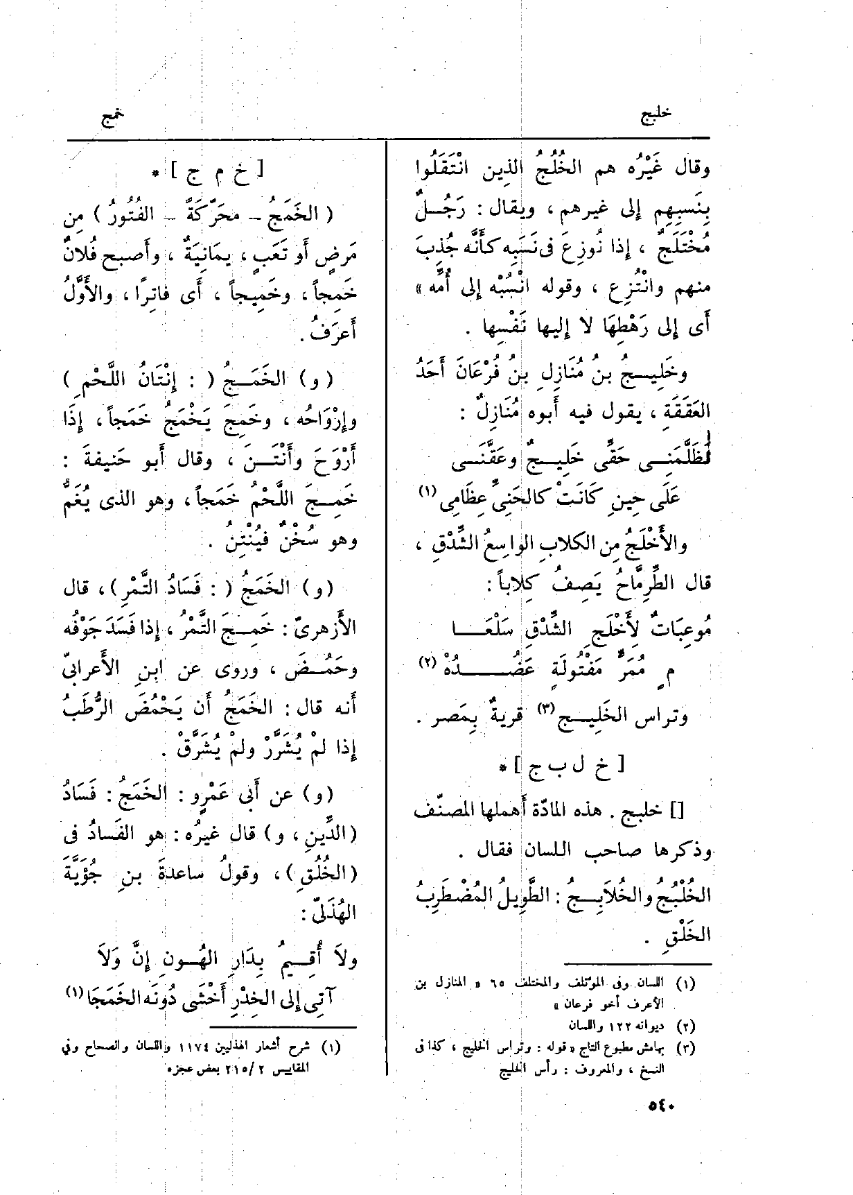 (و) عَن أَبي عَمْرٍ و: الخَمَجُ: فَسَادخ (الدِّين، و) قَالَ غيرُه: هُوَ الفَسادُ فِي (الخُلُقِ) ، وقولُ ساعدةَ بنِ جُؤَيَّةَ الهُذَليّ: