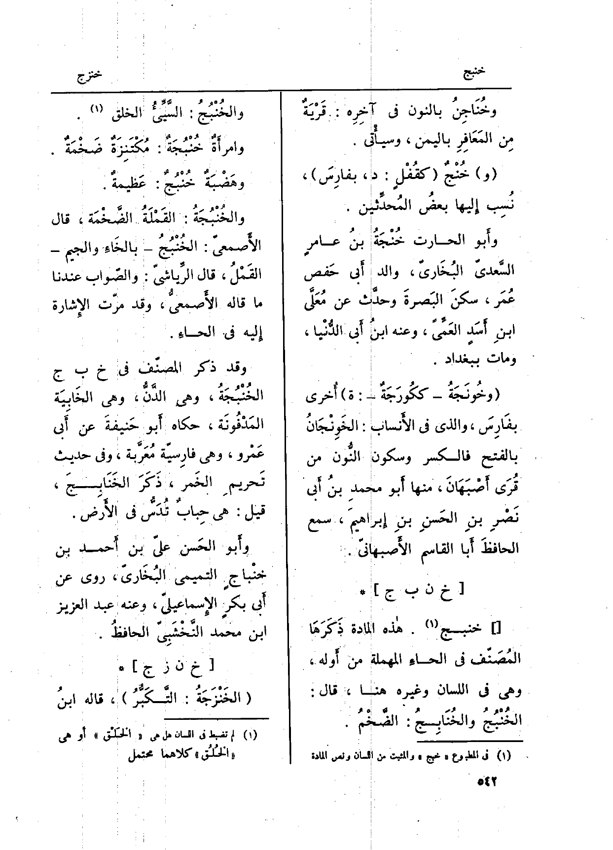 : خنبج. هاذه الْمَادَّة ذَكَرَهَا المُصَنّف فِي الحاءِ الْمُهْملَة من أَوله، وَهِي فِي اللِّسَان وَغَيره هُنَا، قَالَ: الخُنْبُجُ والخُنَابِجُ: الضَّخْمُ.