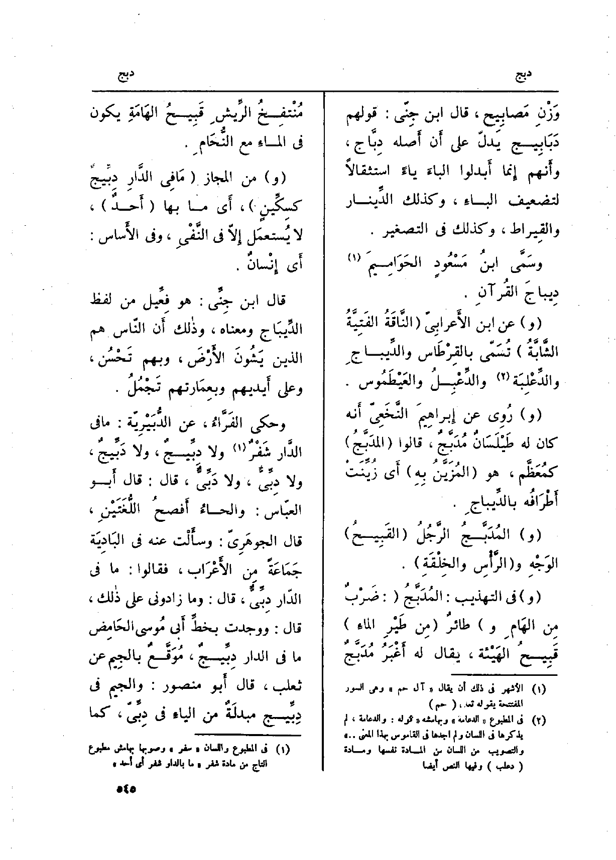 وَزْنِ مَصابِيح، قَالَ ابْن جِنّى: قَوْلهم دَبَابِيج يدلّ على أَن أَصله دِبَّاج، وأَنهم إِنما أَبدلوا الباءَ يَاء استثقالاً لتضعيف الباءِ، وَكَذَلِكَ الدِّينار والقِيراط، وَكَذَلِكَ فِي التصغير.